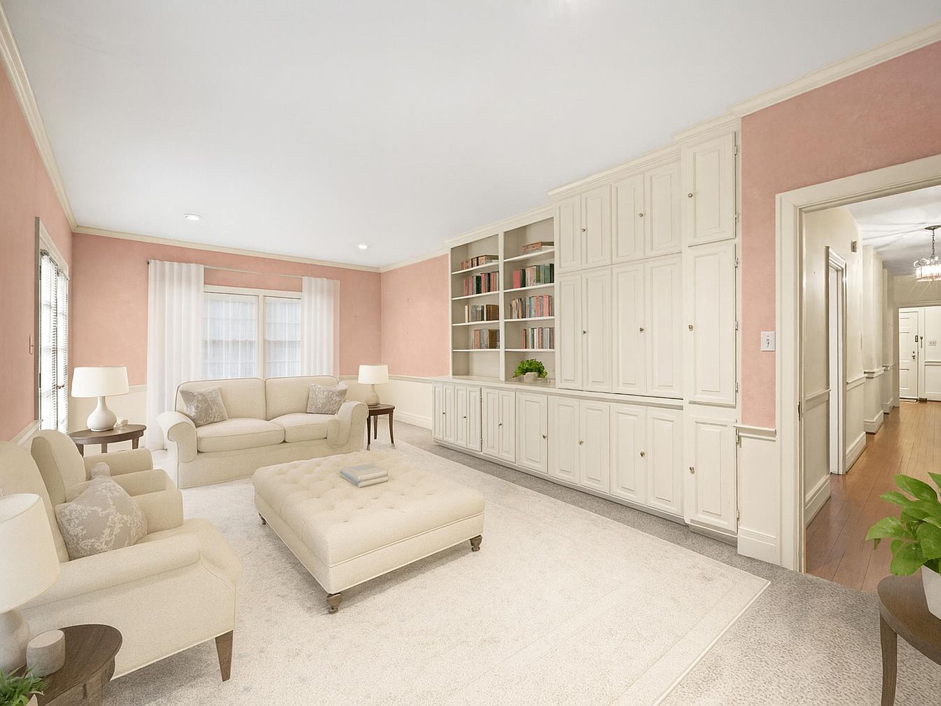 A spacious living room with soft pastel pink walls accented by white trim and molding. Large built-in cabinets and open shelves, filled with neatly arranged books, span almost an entire wall, offering ample storage and classic charm. The furniture includes a cream-colored upholstered sofa, matching armchairs, and a tufted ottoman in the center, sitting atop a plush light carpet. Two side tables with lamps flank the seating area. Natural light pours in through a pair of windows with sheer white curtains, while recessed ceiling lights and elegant wall finishes contribute to the room’s airy, inviting ambiance.
