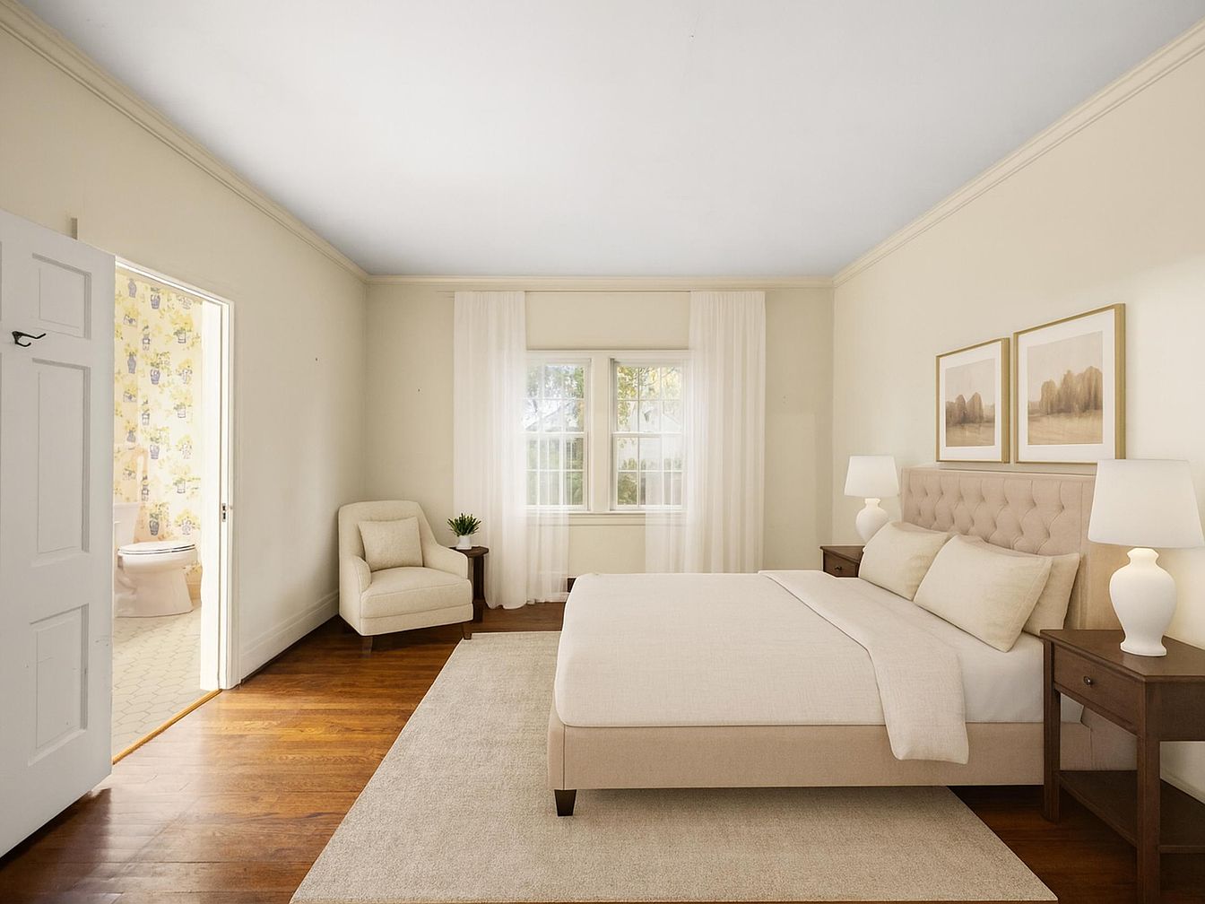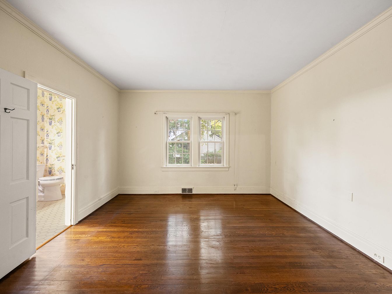 A spacious, empty bedroom features polished hardwood floors that add warmth against the cream-painted walls and ceiling. Crown molding and simple baseboards provide subtle architectural detail. A single window framed by unobtrusive curtain rods brings in natural light and offers a view of the greenery outside. On the left, a door opens to glimpse a connected bathroom, which has hexagonal floor tiles and bright yellow floral wallpaper, creating a vintage contrast to the otherwise minimalist room. The overall aesthetic is classic and understated, with a neutral palette that seeks to highlight the room’s size and original wood floors.