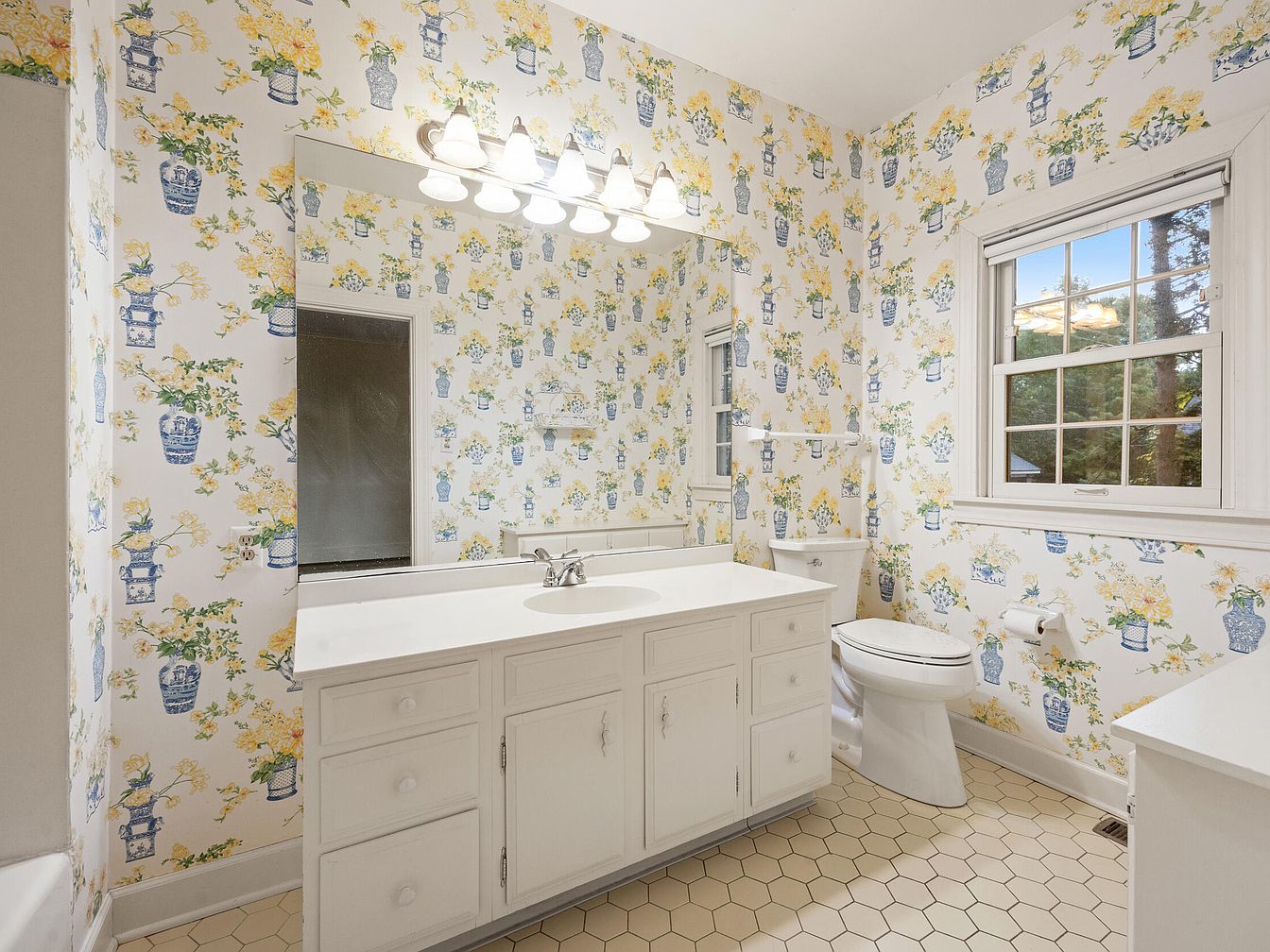 A charming bathroom features a wide white vanity with a single sink, polished chrome faucet, and ample cabinetry beneath. The large mirror above the sink reflects light from a row of five globe-topped bulbs, adding brightness to the room. The walls are covered in playful floral wallpaper with blue vases and yellow flowers, evoking a vintage, cheerful ambiance. Honeycomb-patterned beige floor tiles lead toward a white toilet positioned beneath a window with white trim, allowing natural daylight to fill the space. Clean lines and nostalgic elements create an inviting, cottage-like feel for this classic bathroom retreat.