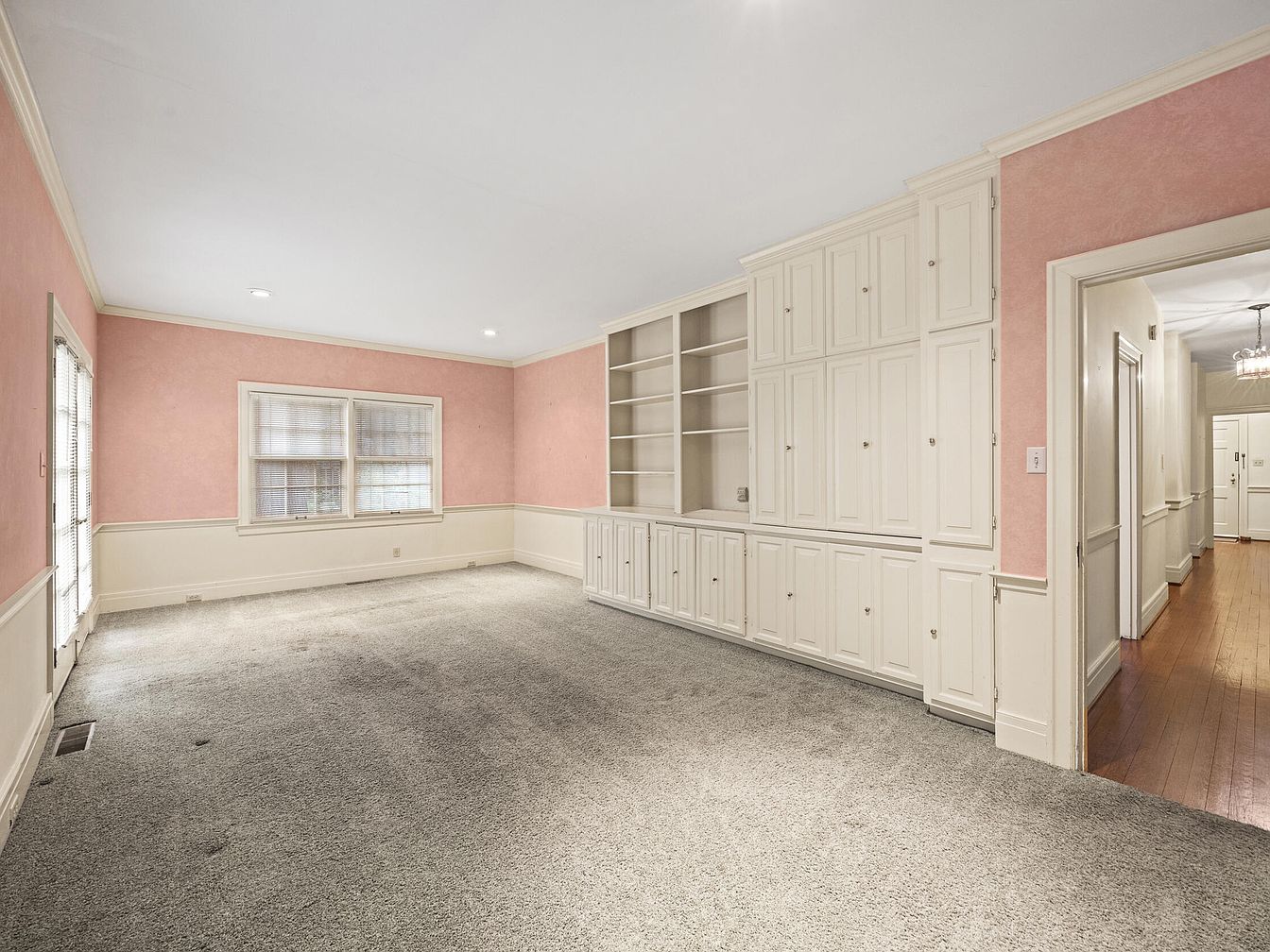 A spacious living room featuring muted pink wallpaper above white wainscoting along the walls, creating a classic and gentle ambiance. Wall-to-wall light gray carpet covers the floor, showing some variation in shading. Large windows bring in natural light from one end, and a set of French doors with blinds opens to the outside. Along one wall, an extensive built-in cabinetry unit stands out, painted creamy white, with ample cabinets and open shelves for storage and display. The ceiling is simple and white with recessed lighting, and the room opens up to a hallway with hardwood flooring visible in the distance.