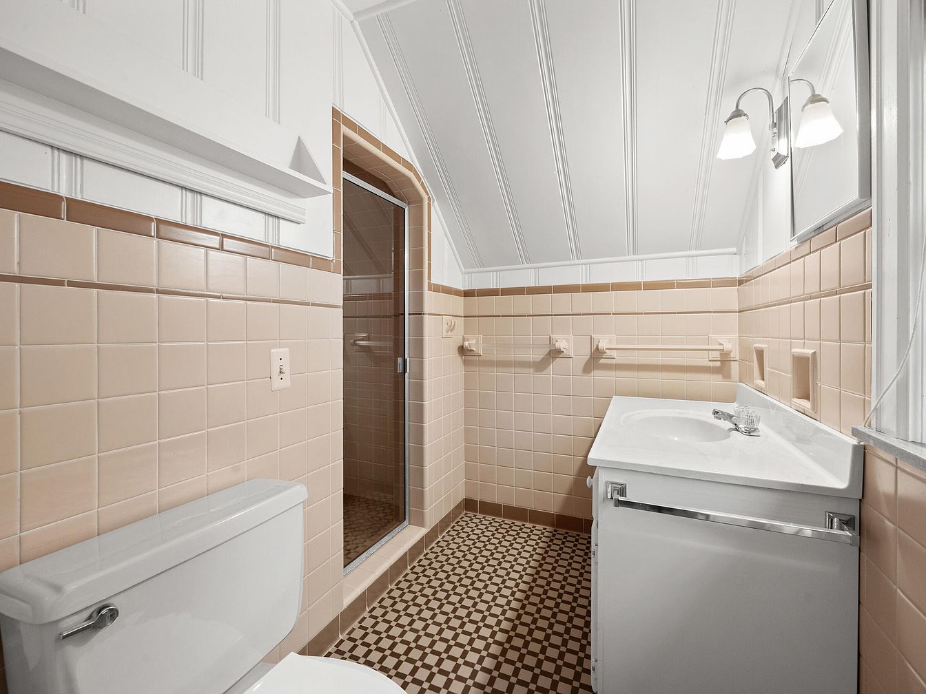 A compact bathroom featuring beige tile walls with a darker taupe accent stripe near the top, creating a warm and retro feel. The floor is covered in a geometric patterned mosaic of brown and beige tiles, complementing the wall colors. There is a white porcelain toilet on the left, and a white vanity with a built-in sink and chrome hardware on the right, under a small wall-mounted mirror with double sconce lights above for illumination. The wall includes built-in ceramic towel bars and soap holders, while a small walk-in shower with a tiled threshold sits toward the back. The sloped, white-paneled ceiling adds historic character.