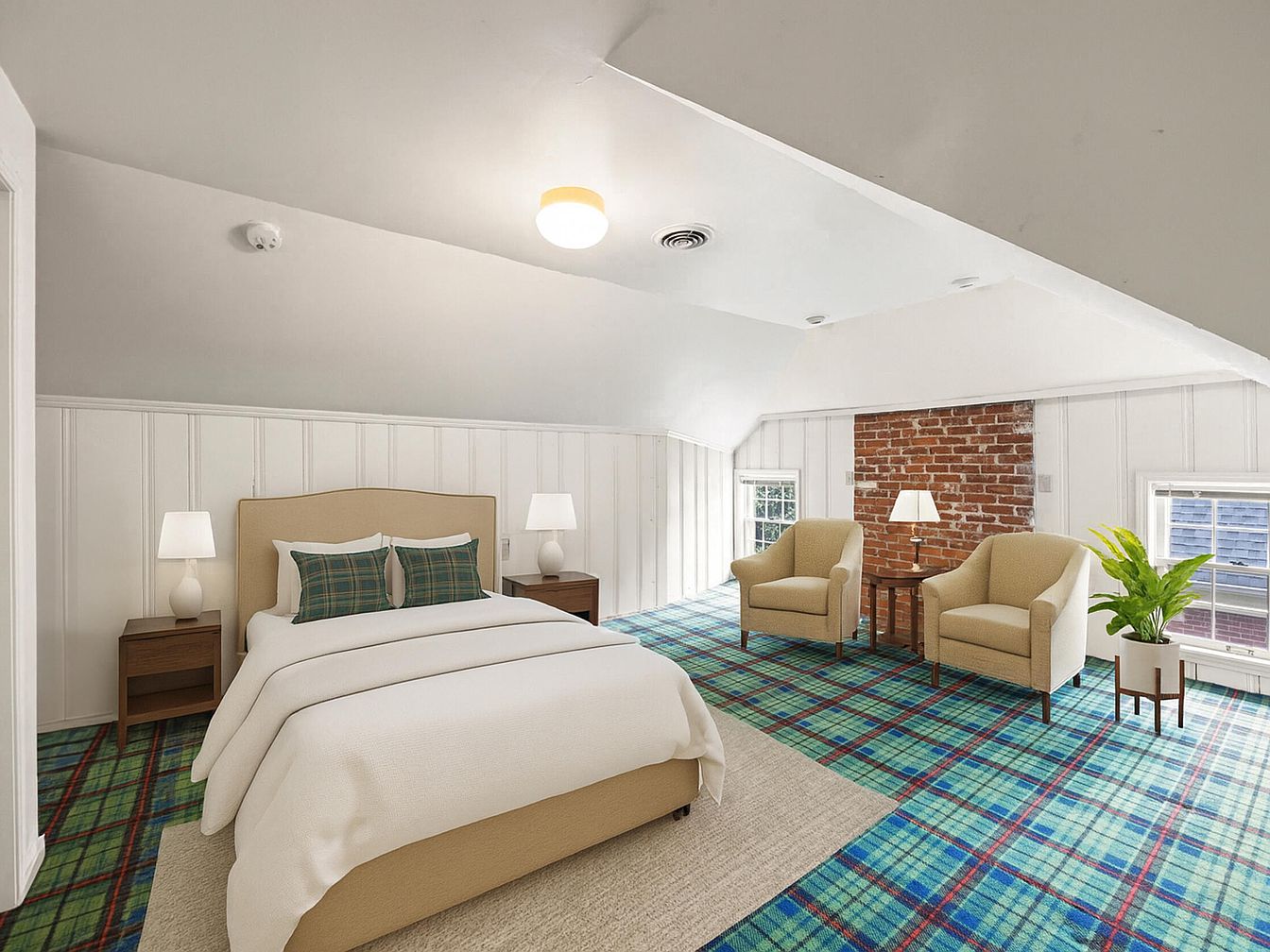 A spacious attic bedroom features sloped white ceilings and board-and-batten wall paneling, lending a cozy yet open feel. The bed, centered against one wall, has a beige upholstered headboard and white bedding with green tartan accent pillows. Matching wooden nightstands flank each side, each topped with a white lamp. Opposite the bed, two beige armchairs and a small round table create a sitting area near an exposed brick accent wall, adding rustic character. Light streams in through two low-set windows. The room’s standout feature is the lively blue and green plaid carpet, providing a burst of color and pattern.