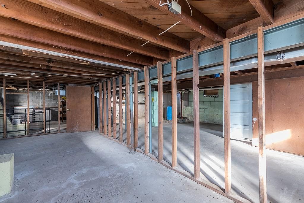 A large, open space with exposed wooden ceiling beams and stud wall framing, typically found in basements awaiting renovation. The concrete floor is unfinished, with patches and marks visible, and the lighting is from natural sunlight streaming through a window or door at the far corner. Areas of painted cinderblock and concrete walls border parts of the room, and some visible utility components add to the functional, rough aesthetic. A wooden door, partially open, separates spaces within the basement, while the overall color palette consists of raw wood, grays, and light greens from the wall blocks.