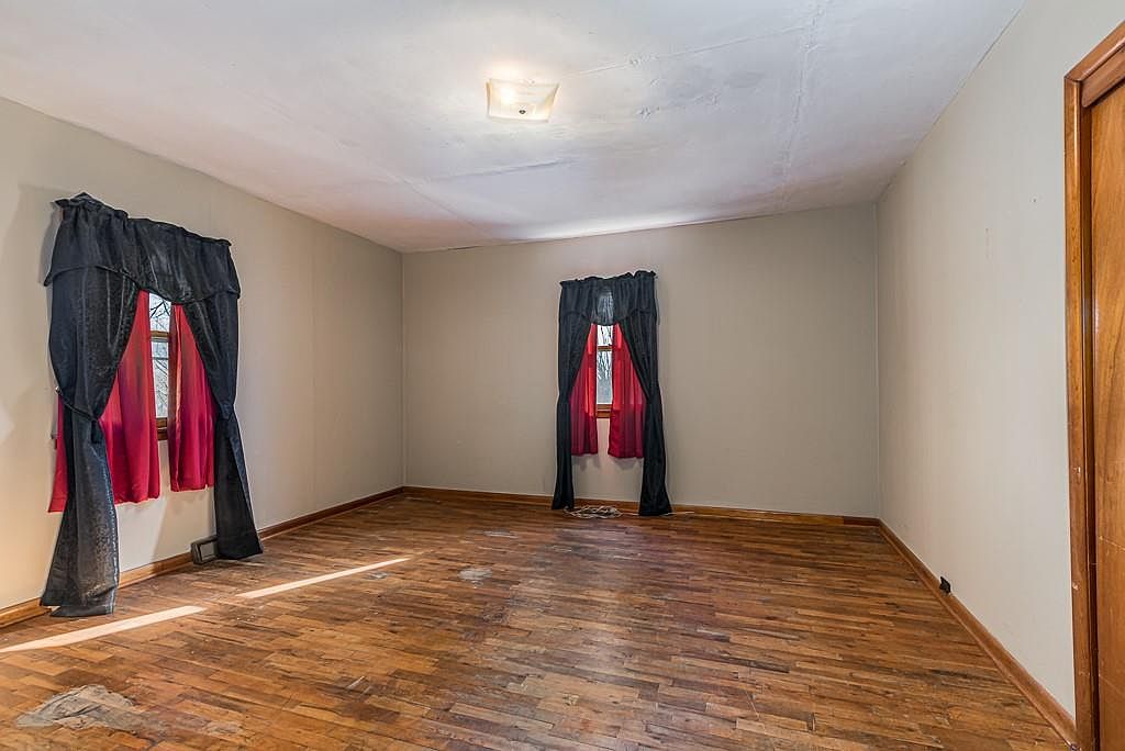 A medium-sized, empty room with worn, natural hardwood floors and light beige walls creates a simple and understated atmosphere. Two narrow windows are positioned on adjacent walls, each adorned with dramatic, dark navy curtains layered over bold, deep red drapes that bring intense contrast and a touch of vintage flair. The trim around the floor and windows is medium wood, matching the floor’s finish. A square, flush-ceiling light fixture provides modest illumination. The space is free of furniture, allowing the aged flooring and contrasting colors of the curtains and walls to define the overall quiet, somewhat moody tone.