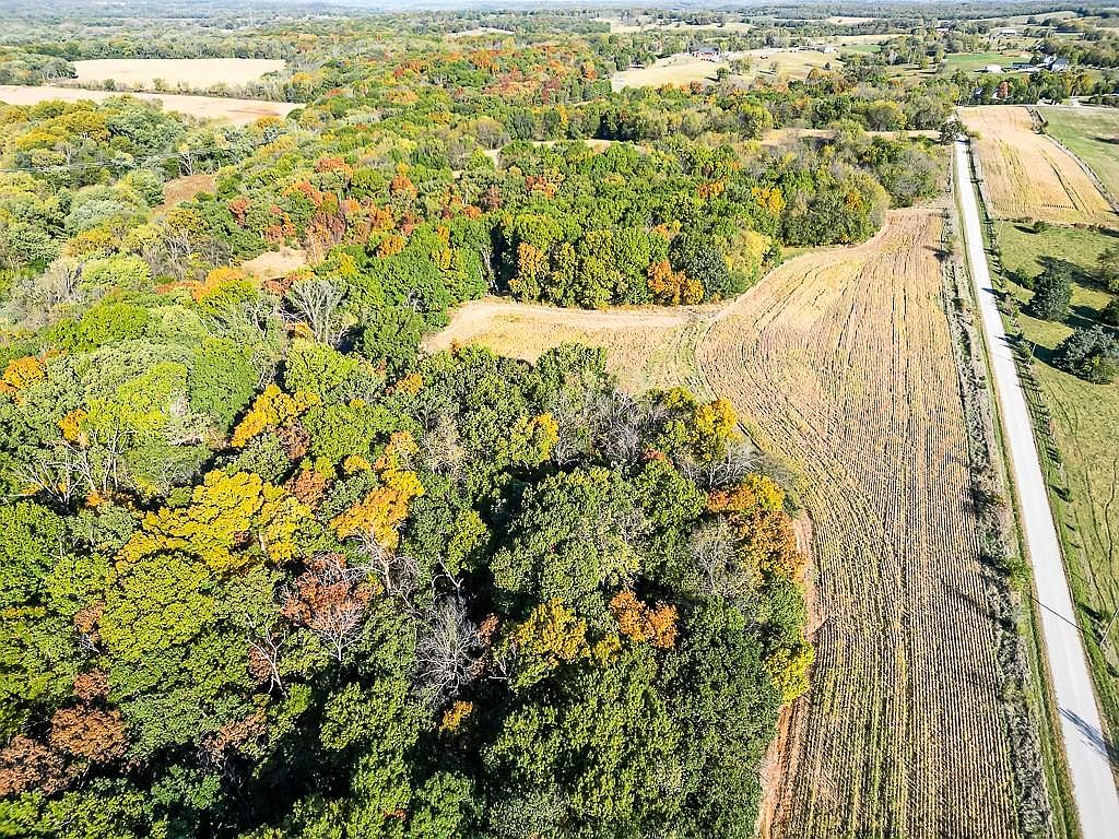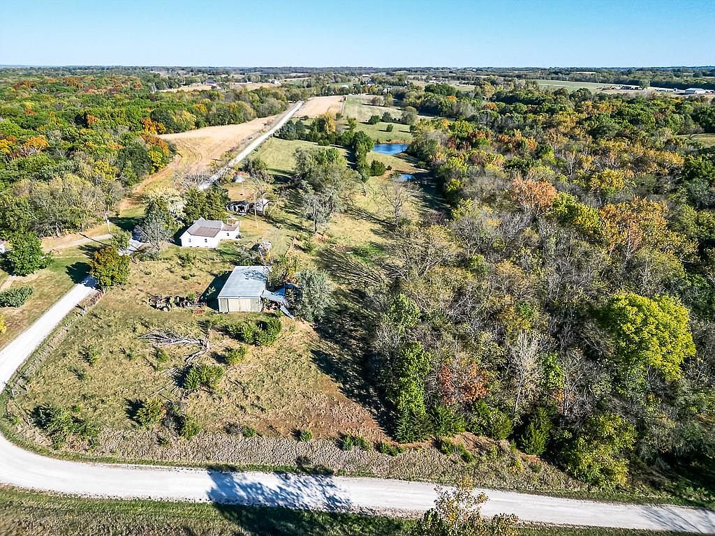 A sweeping aerial view shows a historic rural American property surrounded by expansive fields and dense woodland. The layout features a main house and a large metal outbuilding, both set amid open grassy spaces. A winding gravel driveway cuts through the property, connecting structures and defining the landscape’s boundaries. Seasonal trees offer patches of color, contrasting greens, oranges, and yellows against the open fields. A serene pond glimmers near the center-right, bordered by gently rolling land. The horizon stretches into distant farmland, and the total setting exudes a peaceful, rustic charm synonymous with country living.