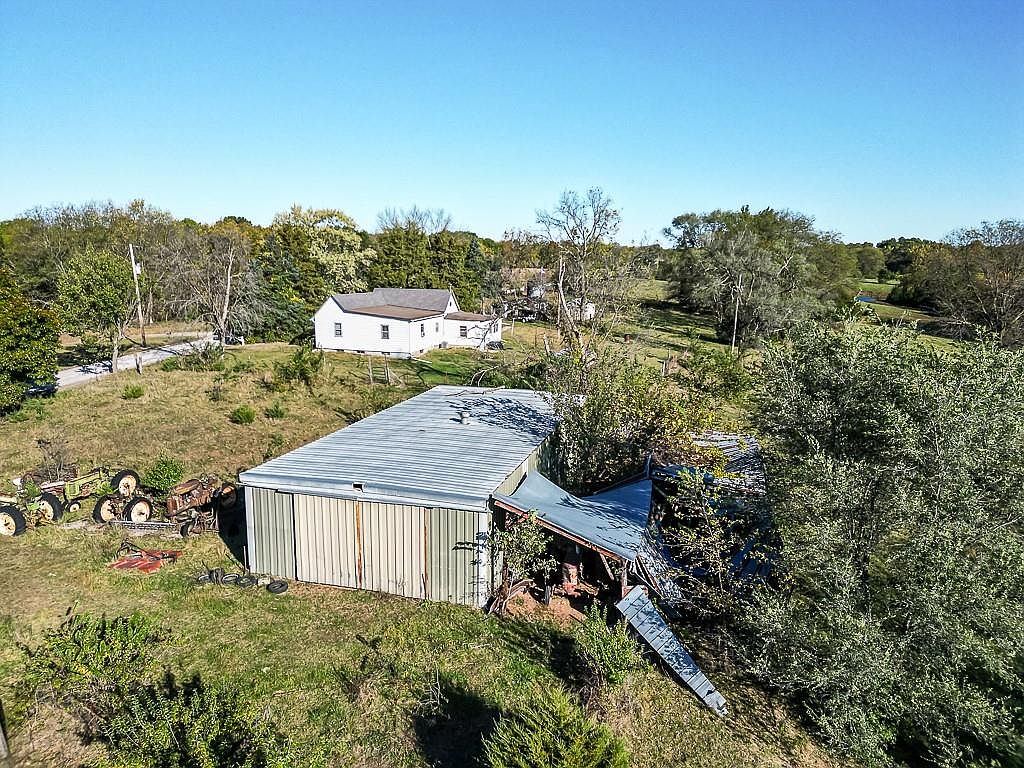 A wide view of a rural property with a large, pale-colored metal outbuilding on the right and a small, single-story white farmhouse with a gray roof in the distance on the left. The landscape is open and grassy, dotted with scattered trees and shrubs, while a vintage green tractor sits in the foreground near modest farming equipment and brush piles. The sky is a clear, vivid blue, and the property feels secluded and expansive, framed by trees along the horizon. The scene evokes a quiet, rustic atmosphere with simple, functional structures and wide outdoor spaces.