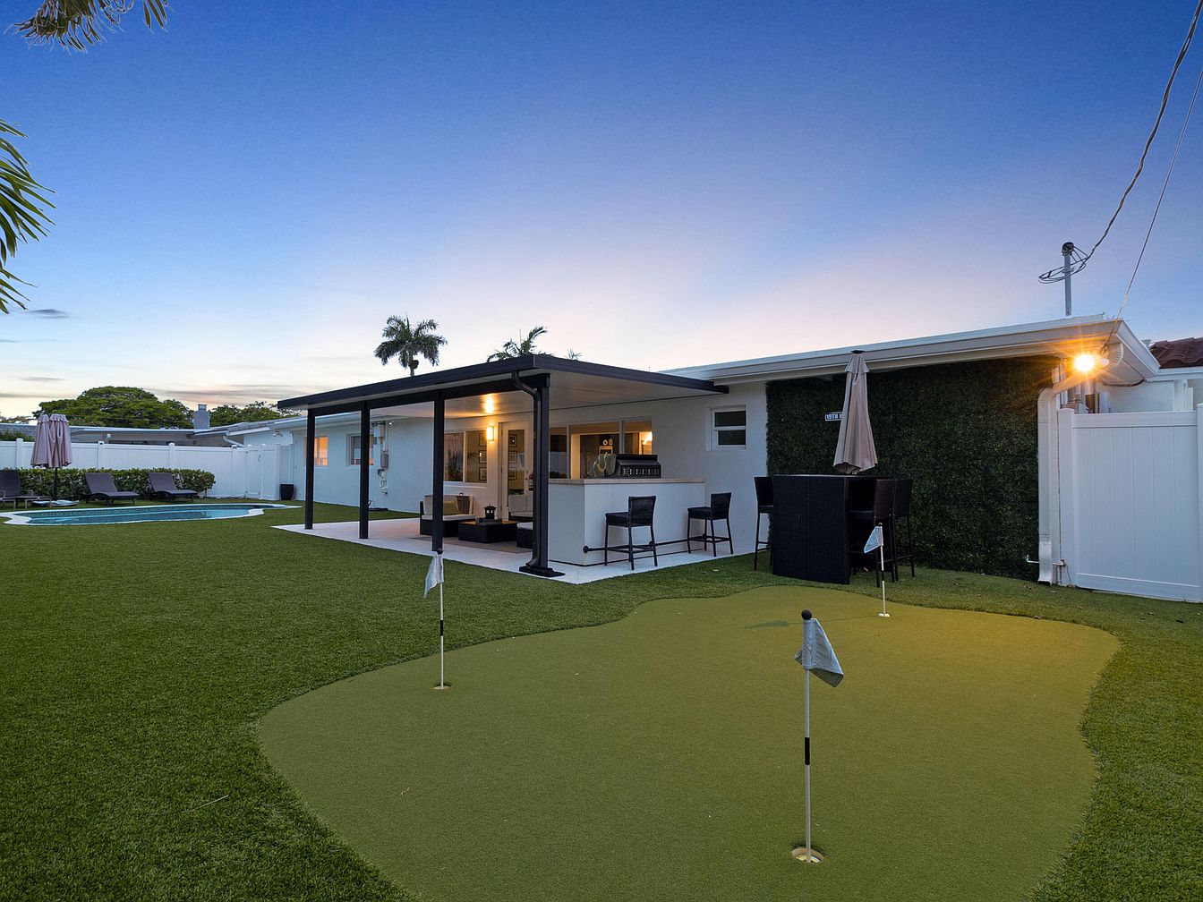 This backyard showcases a contemporary design with a lush, manicured lawn and a striking putting green featuring flag markers. The layout includes a sleek pool on the left, bordered by modern lounge chairs, perfect for relaxation. A covered patio extends from the home, defined by clean lines and black supports, offering shade for outdoor dining. The color scheme blends earthy greens with white walls, providing a fresh and inviting atmosphere. Subtle outdoor lighting and palm trees add an exotic touch, enhancing the tranquil ambiance as dusk approaches, inviting both leisure and social gatherings.