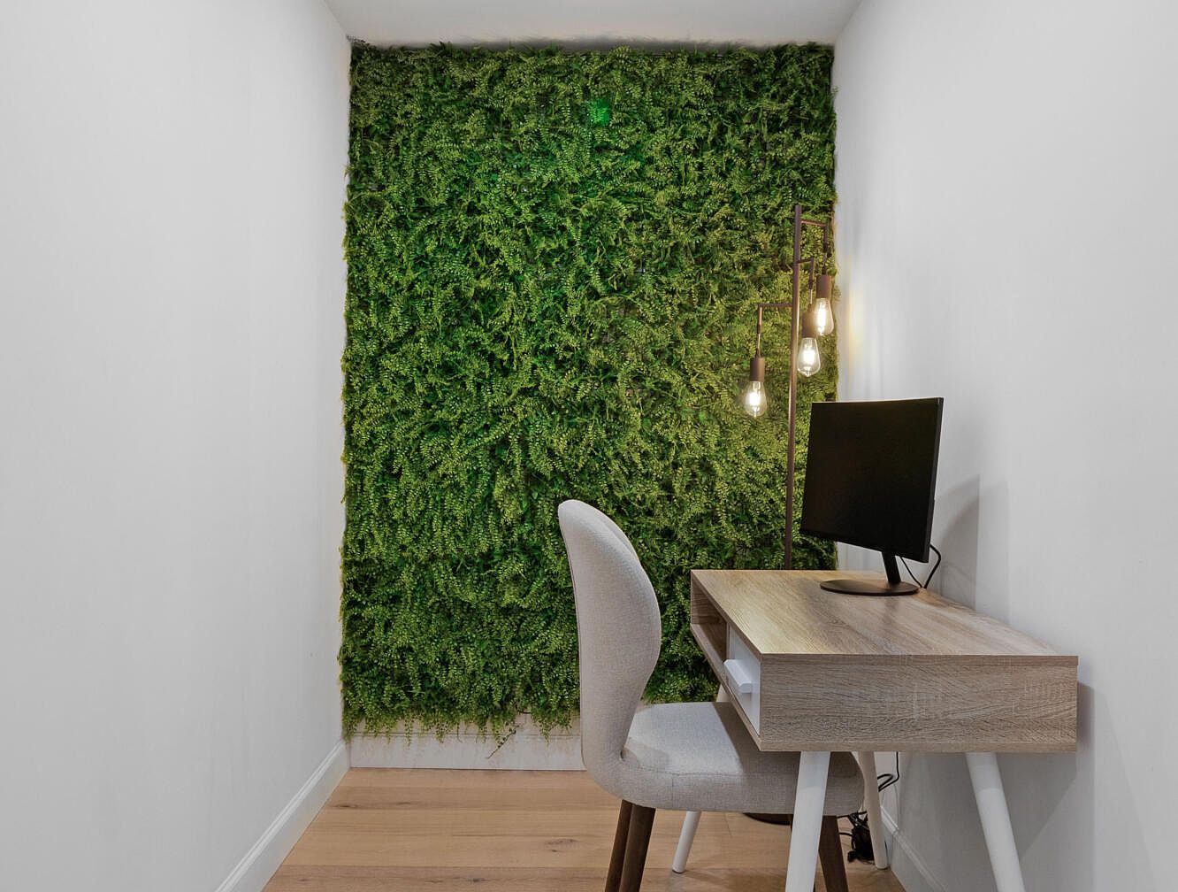 A compact home office showcases a vibrant green moss wall that brings nature indoors, creating a refreshing atmosphere. The layout features a light wooden desk with clean lines and a minimalist design, paired with a soft, cushioned chair in a light gray hue. A sleek monitor rests on the desk, emphasizing functionality. Soft, ambient lighting is provided by a stylish floor lamp with exposed bulbs, adding warmth. The room’s color scheme combines earthy greens and soft whites, enhancing a serene and modern aesthetic. Natural light likely spills in, promoting a bright and inviting workspace.
