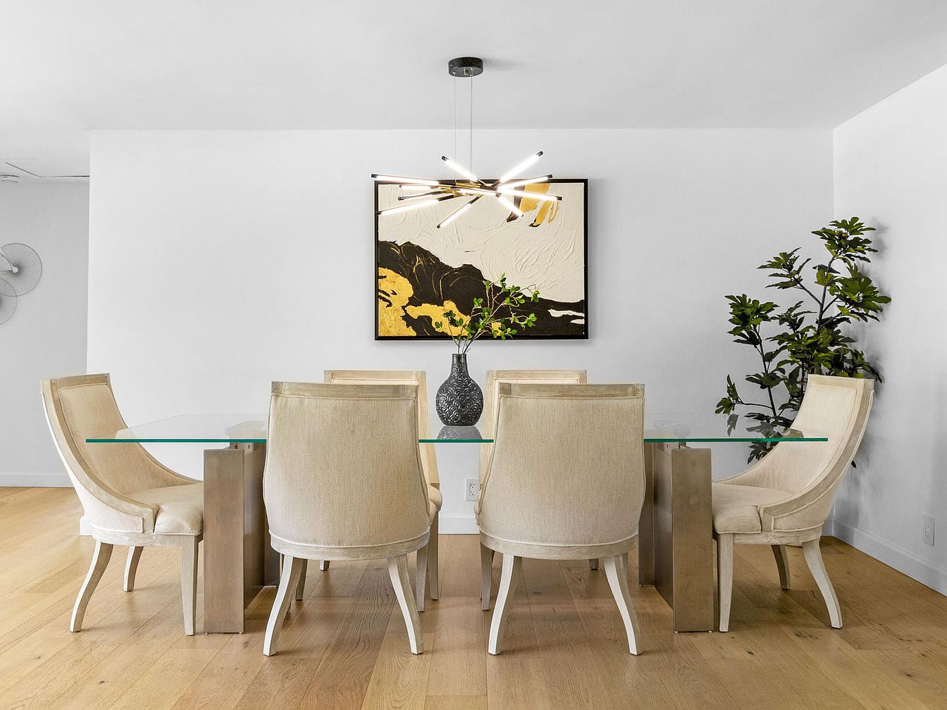 A stylish dining area features a sleek glass table supported by minimalist metallic legs, accommodating six upholstered chairs with light beige fabric. The backdrop is a bright white wall that enhances the spacious feel. Above, a modern light fixture with geometric lines adds a contemporary touch. A large piece of abstract art in black and yellow brings color to the space, drawing attention on the wall. A decorative vase with greenery complements the ambience, while a potted plant in the corner introduces a refreshing natural element, enriching the aesthetic with a blend of modern design and comfort.
