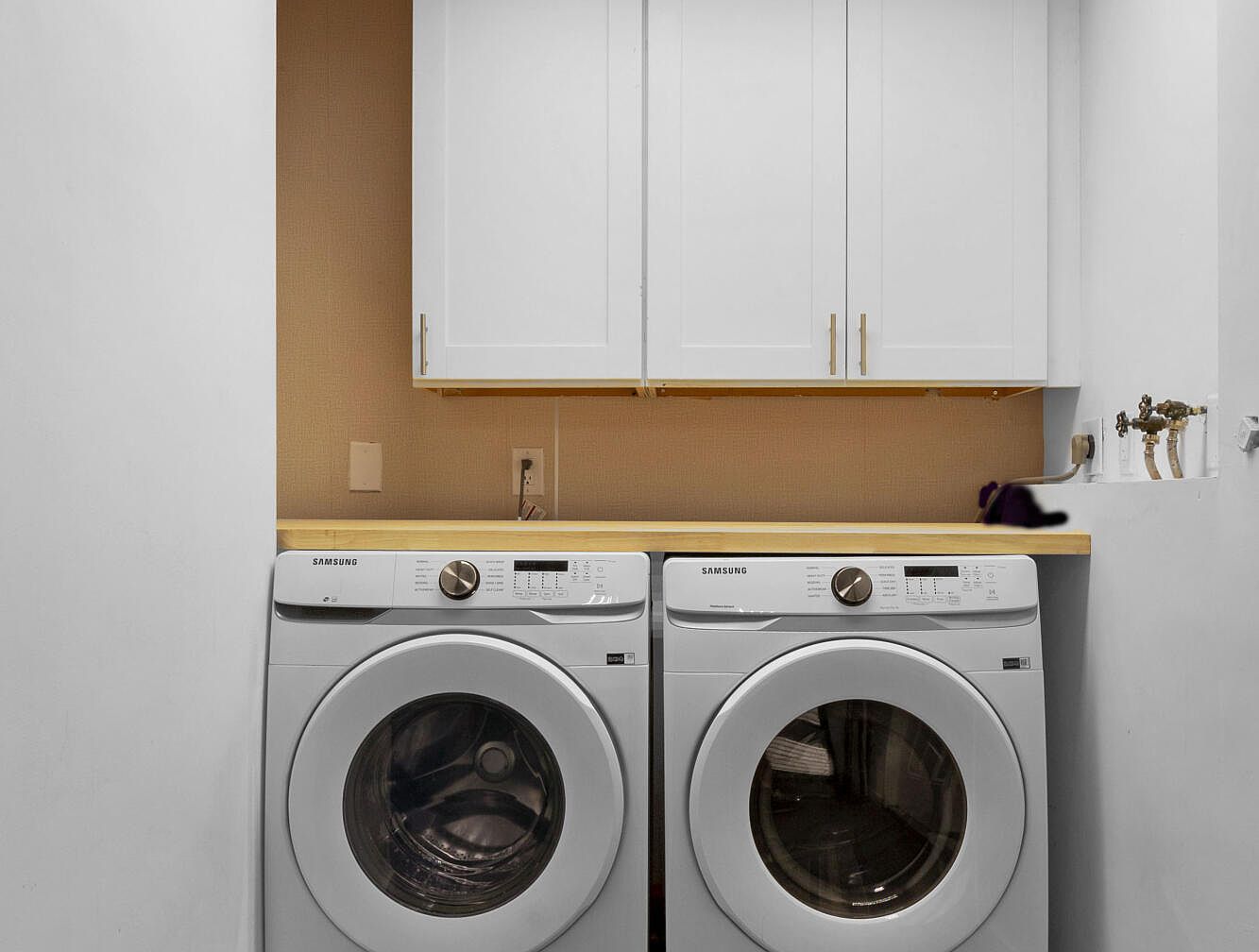 This compact laundry room features modern Samsung washing machines positioned side by side, showcasing a sleek design. Above the machines, pristine white cabinetry provides ample storage, enhancing functionality. The natural wood countertop adds warmth and contrast against the light-colored walls, while a subtle textured backdrop complements the overall aesthetic. With a neutral color scheme predominating, the space feels calm and organized. Efficiently designed plumbing connections are visible but neatly integrated, maintaining a tidy appearance. The layout maximizes utility, turning an often-overlooked area into a stylish and practical part of the home.