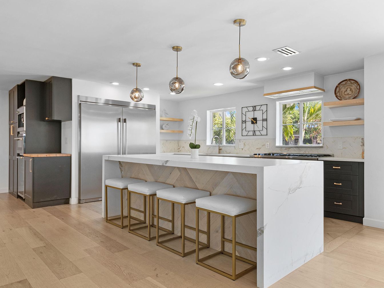 This modern kitchen showcases sleek design with a spacious island featuring a white marble countertop accented by subtle golden veining. Dark cabinetry contrasts elegantly against the light walls, while stainless steel appliances add a contemporary touch. Three glass pendant lights with golden fixtures hang gracefully above the island, providing ambient illumination. A clock with a minimalist design adorns the wall, harmonizing with the overall aesthetic. Large windows invite natural light, offering views of palm trees outside and enhancing the airy feel. The open layout seamlessly connects to an adjacent space, promoting an inviting atmosphere for gatherings.