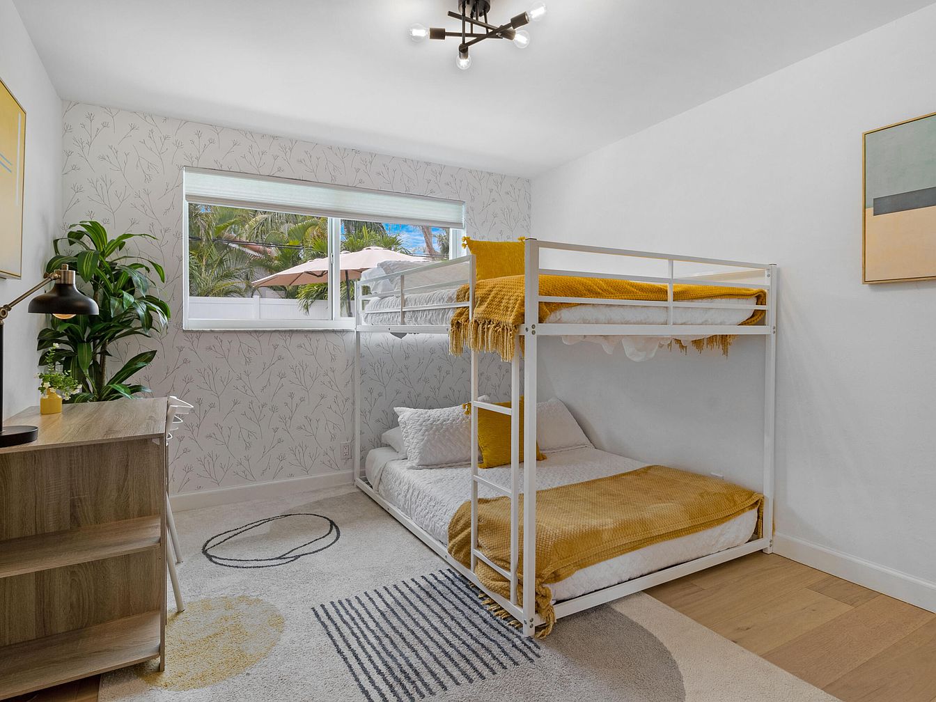 This bedroom features a modern design with a light and airy atmosphere. The walls are adorned with delicate floral wallpaper, enhancing the tranquil vibe. A bunk bed occupies one side, dressed in bright yellow and white textiles, adding a cheerful touch. A simple wooden desk with a stylish lamp sits adjacent, creating a study area. Natural light floods in through a large window, revealing a peek of lush greenery outside. A soft area rug anchors the space, showcasing circular patterns and subtle stripes. The combination of colors and textures fosters a cozy, inviting retreat for relaxation.