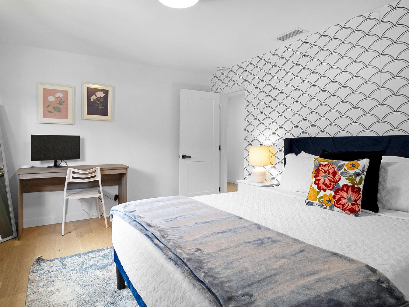 This cozy bedroom features a soft color palette dominated by white and light wood tones, creating an airy atmosphere. The bed is dressed in crisp white linens, complemented by a floral accent pillow that adds a pop of color. Against one wall, a decorative, scallop-patterned wallpaper introduces subtle texture and visual interest. A desk with a minimalist chair sits near the entrance, equipped with a monitor, perfect for work or study. A stylish lamp casts a warm glow beside the bed, while a patterned rug grounds the space. Overall, it’s a blend of modern comfort and chic design.
