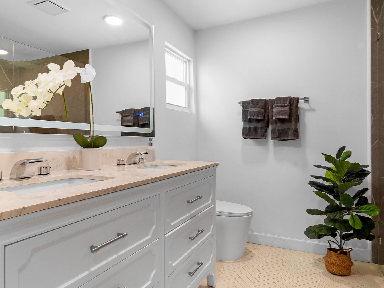 This modern bathroom features a spacious layout with dual sinks set against a stylish light-colored cabinetry. The countertops are a subtle marble, complementing the clean white walls and enhancing the bright atmosphere. A large mirror stretches across the back wall, reflecting light and creating depth. Soft gray towels hang elegantly on a sleek metal rack, adding a touch of warmth. A small potted orchid brings a hint of nature, while a leafy plant in a textured planter enhances the serene feel. The herringbone-pattern ceramic tiles underfoot contribute to the room’s contemporary aesthetic, ensuring both style and comfort.