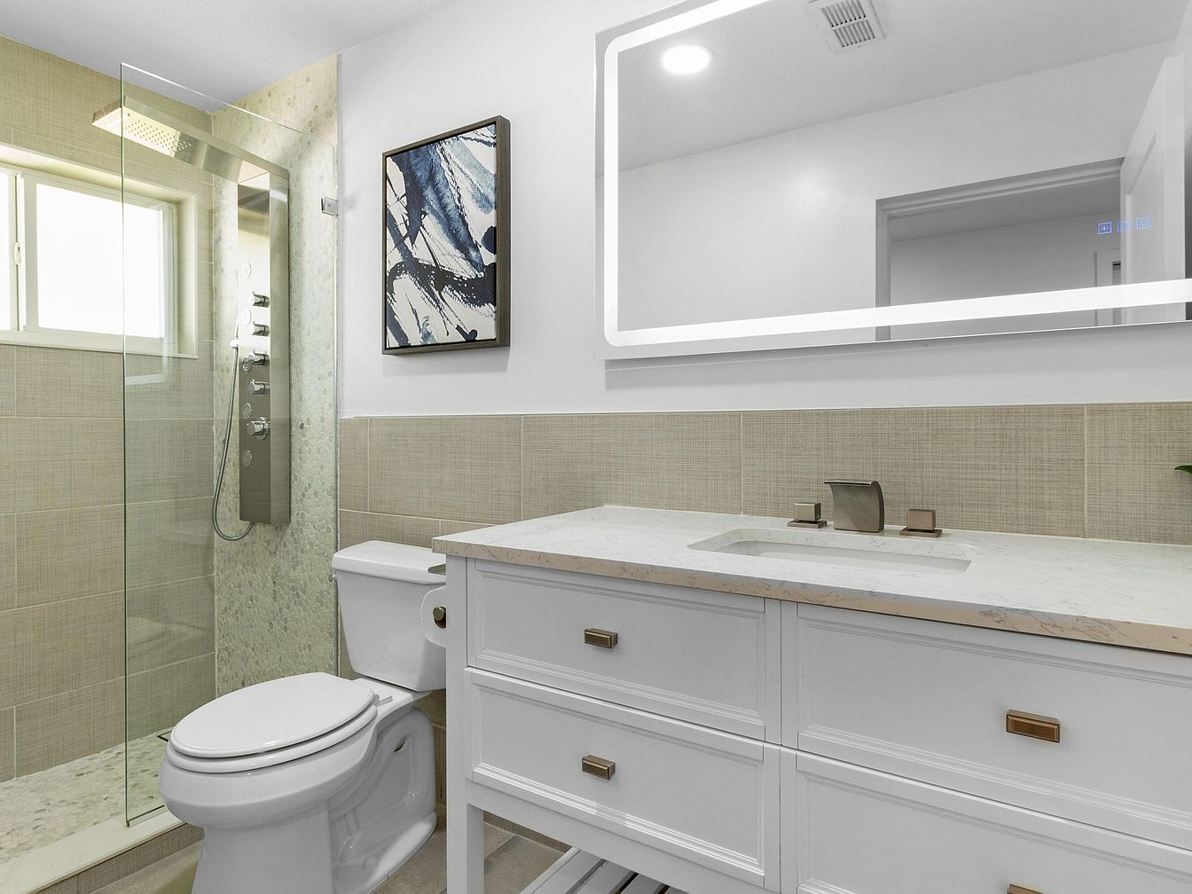 This contemporary bathroom features a sleek and modern design with clean lines. The color palette is predominantly white, with textured beige tiles adorning the walls, providing warmth and contrast. A glass shower enclosure showcases a luxurious rain shower fixture and a minimalist aesthetic. The vanity is elegantly crafted with white cabinetry and a refined marble countertop, complemented by stylish brass hardware. A large, illuminated mirror enhances the sense of space and brightness. Natural light filters through a window, reflecting off the surfaces, while a piece of abstract art adds a creative touch to the serene atmosphere.