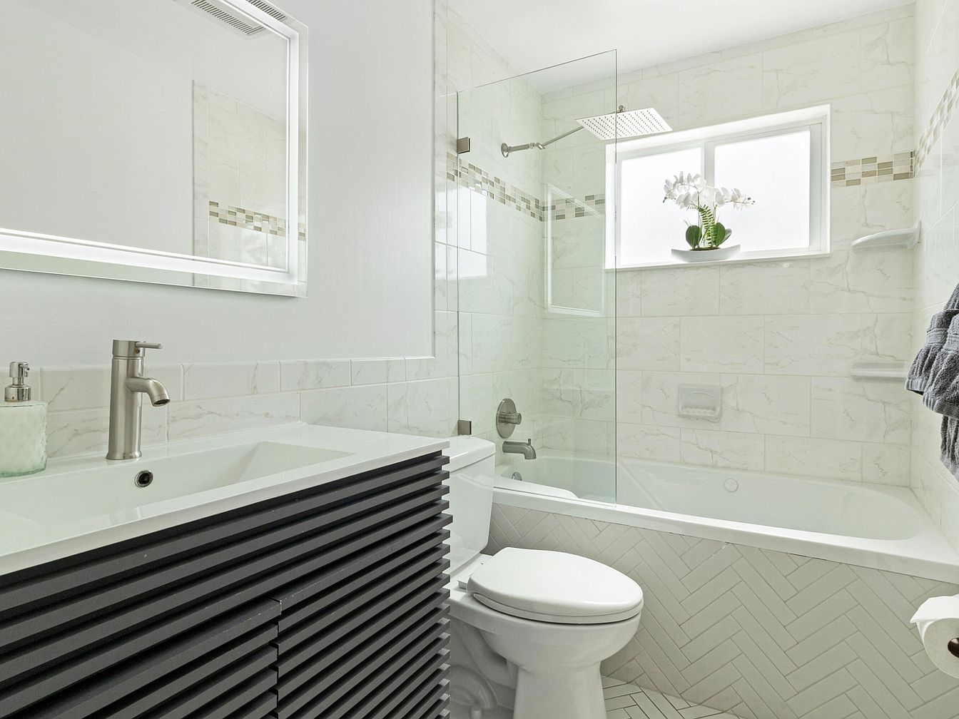 The bathroom features a fresh and modern design with a sleek, minimalist layout. The walls are adorned with elegant white marble tile, complemented by herringbone-patterned flooring in a subtle grey tone. A contemporary glass shower enclosure showcases a rain showerhead, while a large window illuminates the space, adorned with an orchid in a minimalist planter. The floating vanity, with its striking horizontal slats in black, contrasts beautifully against the crisp white countertop and a modern faucet. An illuminated mirror enhances the airy feel, while neatly arranged toiletries in soft hues add a touch of sophistication.