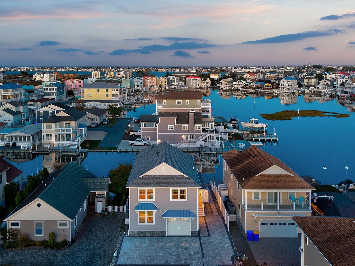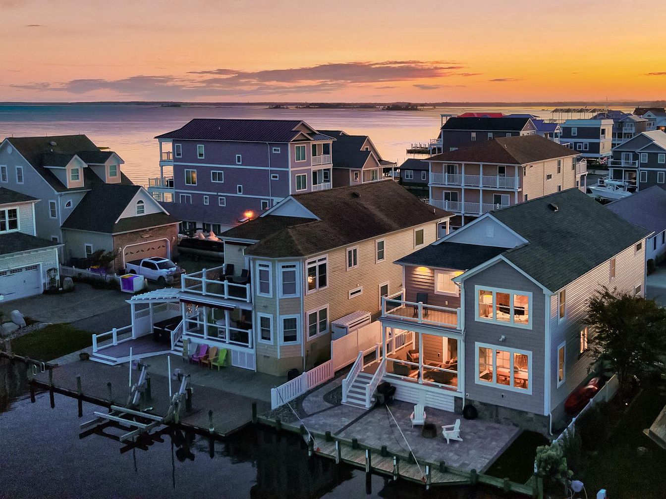The image captures an aerial perspective of a vibrant waterfront neighborhood, characterized by an array of colorful homes. The buildings are primarily two stories, with a coastal architectural style, featuring shingles and balconies that overlook the water. A serene body of water reflects the pastel hues of the evening sky. Paved pathways lead to docks where boats are moored, enhancing the maritime ambience. Lush greenery adorns the properties, while the layout reveals a harmonious blend of residential living with nature. The scene emanates tranquility, perfect for leisure and outdoor activities in this picturesque setting.