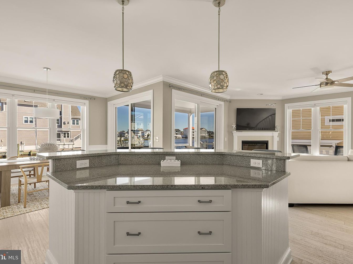 This modern kitchen features a spacious layout with a central island topped with dark granite, providing ample prep space. White cabinetry with sleek hardware complements the light-gray walls, creating a bright ambience. Pendant lights with a decorative design hang above the island, adding visual interest. Large windows wrap around, allowing natural light to flood the space and offering views of the outdoors. The dining area, adjacent with a wooden table and minimalist chairs, enhances the open concept. Soft tones of beige and white are accentuated by warm wood accents, fostering an inviting atmosphere that encourages socializing.