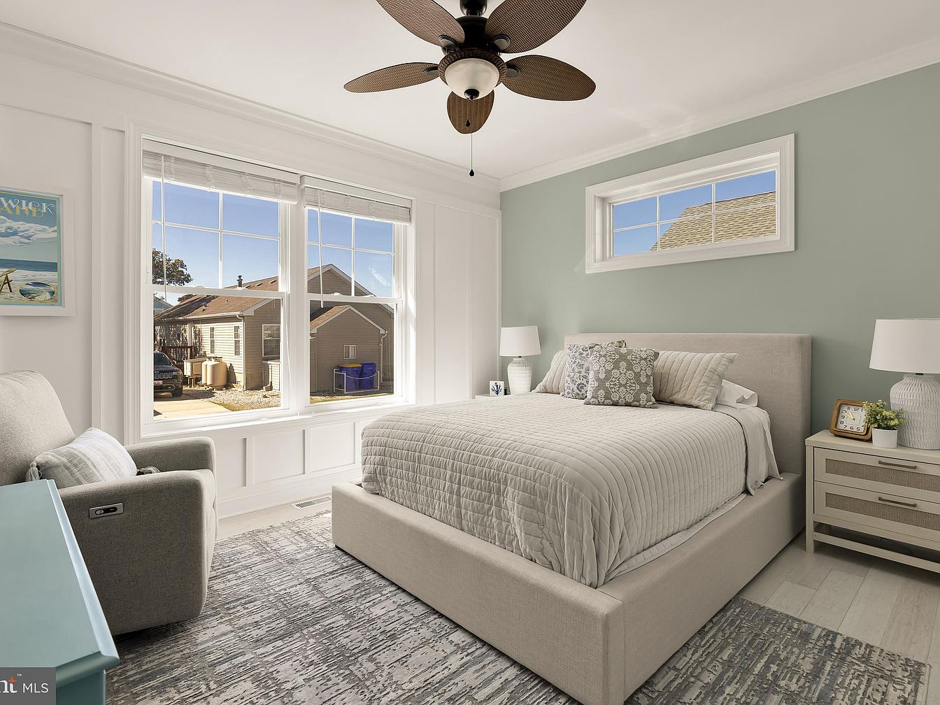 This bright bedroom features a calming palette of soft greens and whites. A cozy bed with a beige upholstered frame sits against a light green accent wall, adorned with decorative pillows. Flanking the bed are minimalistic nightstands with textured surfaces and stylish lamps. A comfortable gray armchair adds a touch of relaxation, complemented by a contemporary area rug that introduces subtle patterns. Large windows allow natural light to flood the room, enhancing the airy vibe. Architectural details include wainscoting and a ceiling fan with wooden blades, seamlessly blending modern comfort with inviting aesthetics.