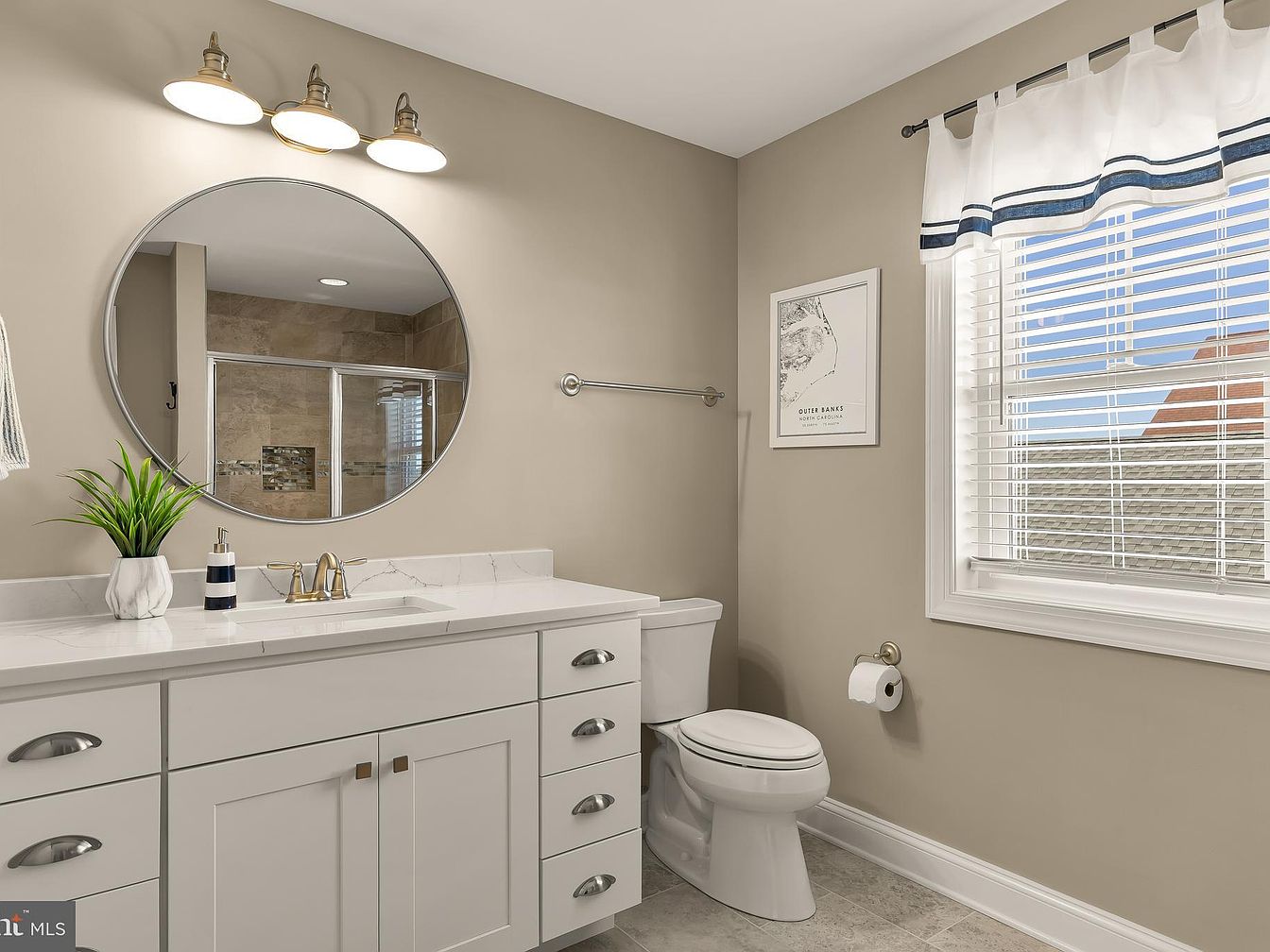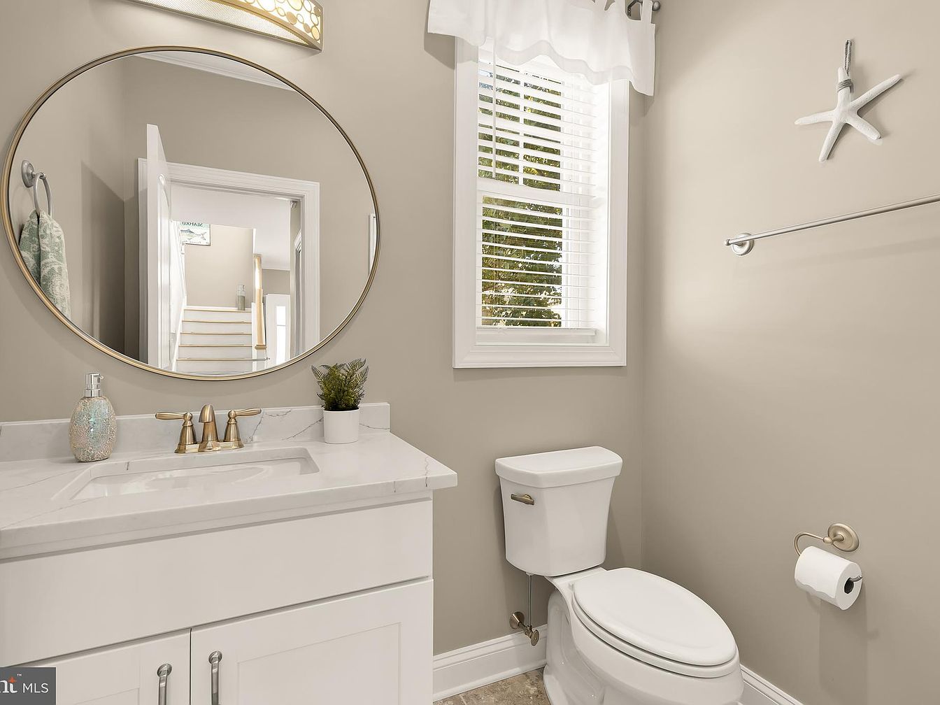 This bathroom showcases a modern design with a light, neutral color palette that enhances the sense of space. A circular mirror above the sleek white vanity reflects soft lighting, creating an inviting ambiance. The countertop, finished in a subtle marbled pattern, complements the clean lines of the cabinetry below. A stylish faucet in brushed gold adds a touch of elegance. Natural light streams in through a window adorned with white blinds, illuminating a small potted plant. A starfish decor subtly emphasizes a coastal theme, while the well-placed towel bar and toilet roll holder demonstrate thoughtful organization.