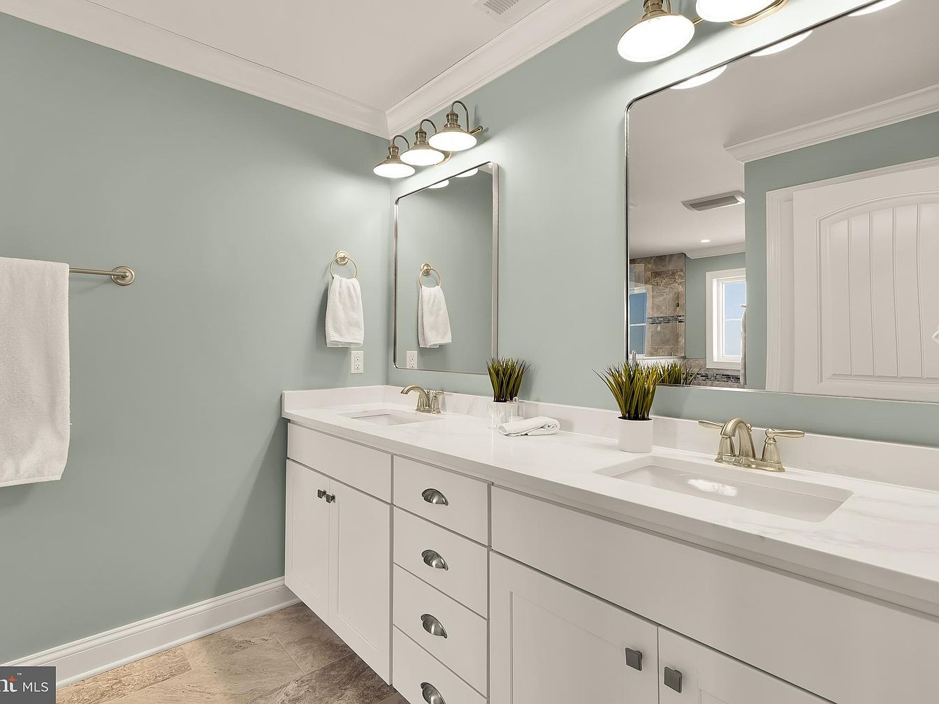 A spacious bathroom featuring soft blue-green walls that create a tranquil atmosphere. The white cabinetry includes clean lines, complementing the sleek, white marble countertop which holds dual sinks. Above, two large mirrors amplify natural light with stylish, modern light fixtures. Towels neatly hang on brushed nickel holders, and subtle greenery in small pots adds a touch of warmth. The flooring showcases large, neutral-toned tiles that enhance the room’s spaciousness. Architectural details like crown molding frame the ceiling, adding sophistication while the contemporary design elements maintain a fresh, uncluttered aesthetic, perfect for relaxation.