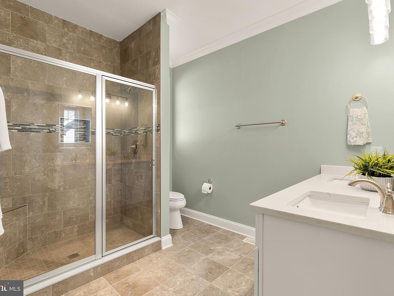 This bathroom features a modern layout with a light, airy feel. A glass-enclosed shower showcases beige stone tiles, complemented by a decorative strip of darker tiles. The walls are painted in a soft, mint green, enhancing the tranquil ambiance. A white double vanity with a sleek countertop sits adjacent, adorned with a small plant adding a touch of nature. Recessed lighting illuminates the space alongside a stylish pendant light. The floor is tiled in a coordinated beige, creating visual harmony. Stainless steel fixtures provide a contemporary touch, while the arrangement promotes functionality and relaxation.