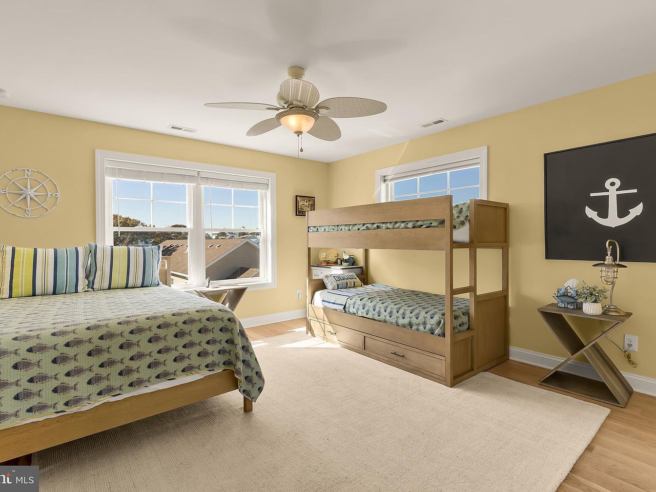 A cozy bedroom featuring a light yellow wall color that creates a warm atmosphere. A comfortable bed with a patterned blue and green quilt occupies one side, complemented by striped pillows. Next to it stands a stylish wooden bunk bed, stained in a light finish, with blue and green bedding adding a playful touch. The room benefits from ample natural light streaming in through large windows, showcasing a serene view. An anchor-themed wall art and a nautical-inspired decorative wheel enhance the seaside vibe. A modern, angular side table holds decorative elements, maintaining a contemporary yet inviting feel.