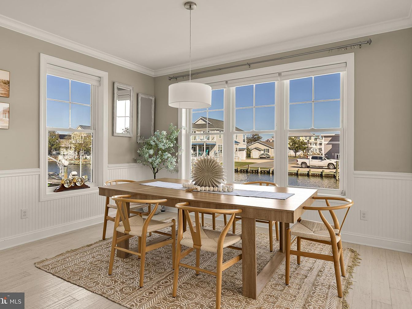 A bright dining room features large windows overlooking a serene canal, enhancing the natural light within. The walls are painted in a soft beige, creating a warm and inviting atmosphere, complemented by white wainscoting that adds architectural interest. A stylish wooden table with a simple centerpiece dominates the space, surrounded by light wooden chairs that highlight a clean, contemporary aesthetic. A textured area rug lies beneath, adding comfort and warmth. Decorative elements include framed artwork on the walls and a lush green plant, contributing to a fresh and elegant ambiance perfect for gatherings.