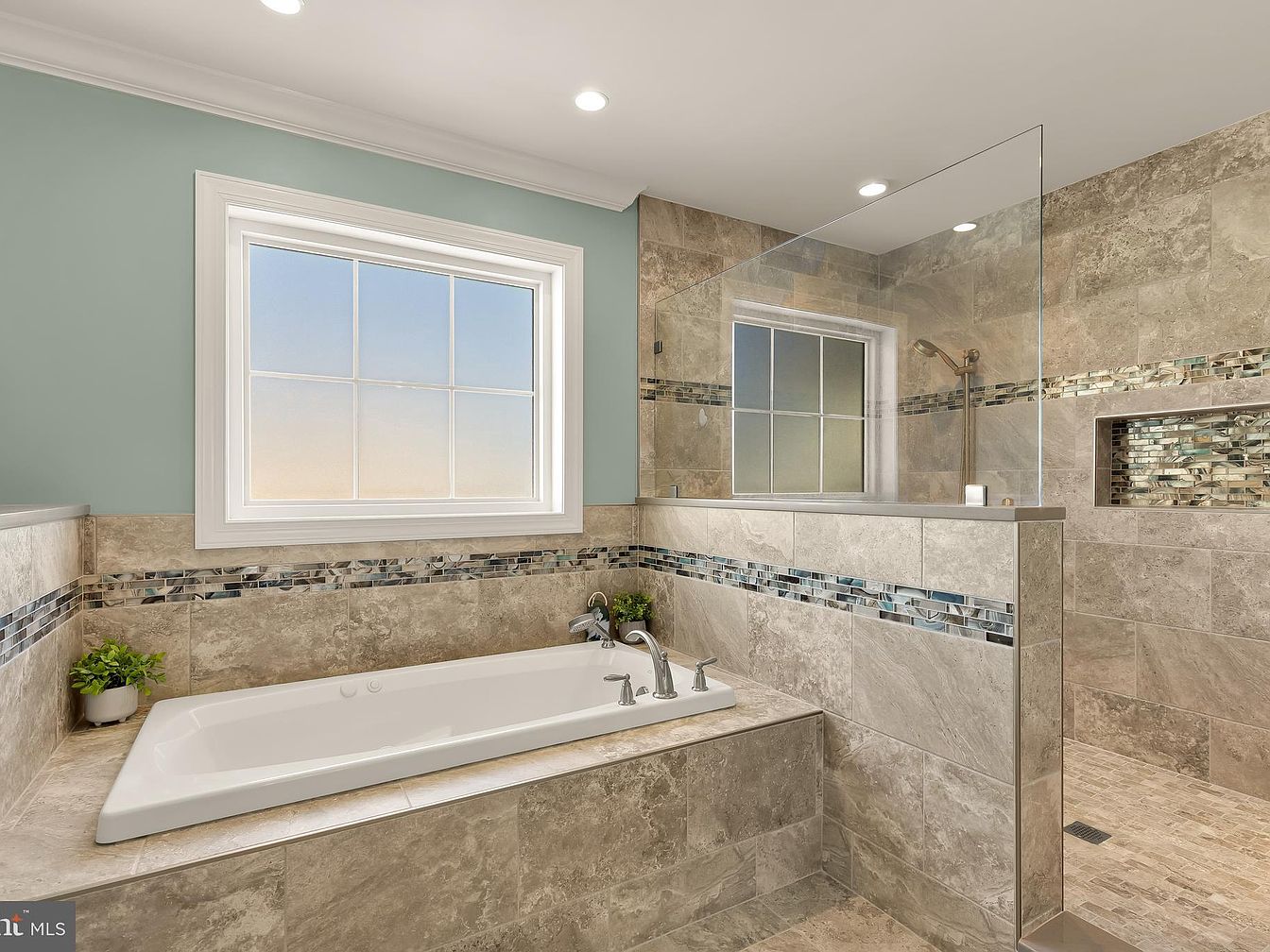 A serene bathroom space featuring a deep soaking tub with polished chrome fixtures nestled against a textured stone wall. The color scheme harmonizes soft mint green walls with earthy beige tiles, adorned with chic mosaic accents. Natural light floods the room through a large window, highlighting the elegant glass shower enclosure that blends seamlessly with the overall design. Decorative plants add a touch of greenery, enhancing the calming atmosphere. The flooring consists of light tiles, creating continuity, while the stylish finishes and modern architectural lines reflect contemporary elegance, making this bathroom a luxurious retreat.