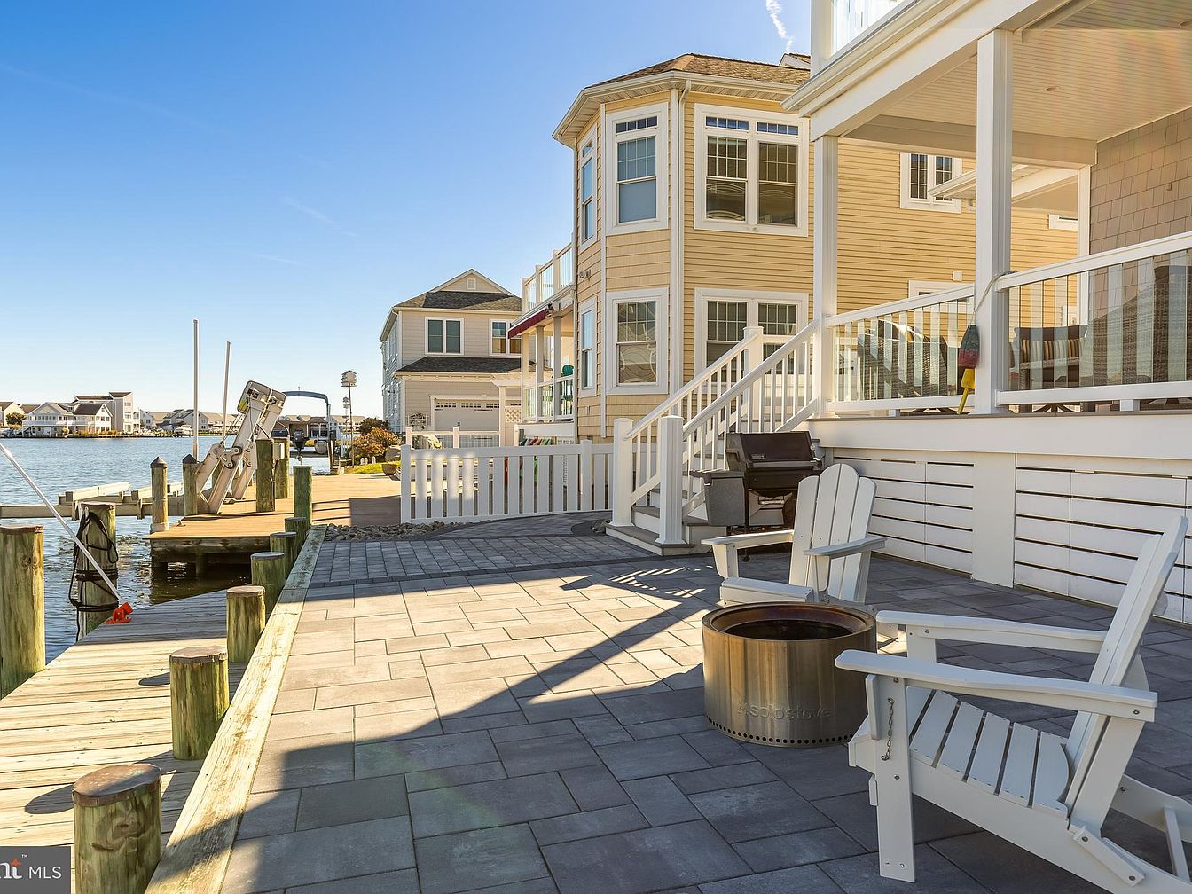 The outdoor patio features a spacious stone surface, laid with large, square pavers in neutral tones. Bright white adirondack chairs are arranged around a sleek, metallic fire pit, inviting relaxation and social gatherings. A view of the serene waterway complements the setting, with a wooden dock visible to the left, lined by vertical posts. The home showcases a classic coastal architectural style, with beige siding and multiple windows creating a bright atmosphere. The surrounding environment is enhanced by a clear blue sky, bringing natural light and warmth to this inviting outdoor space, perfect for leisure and family gatherings.