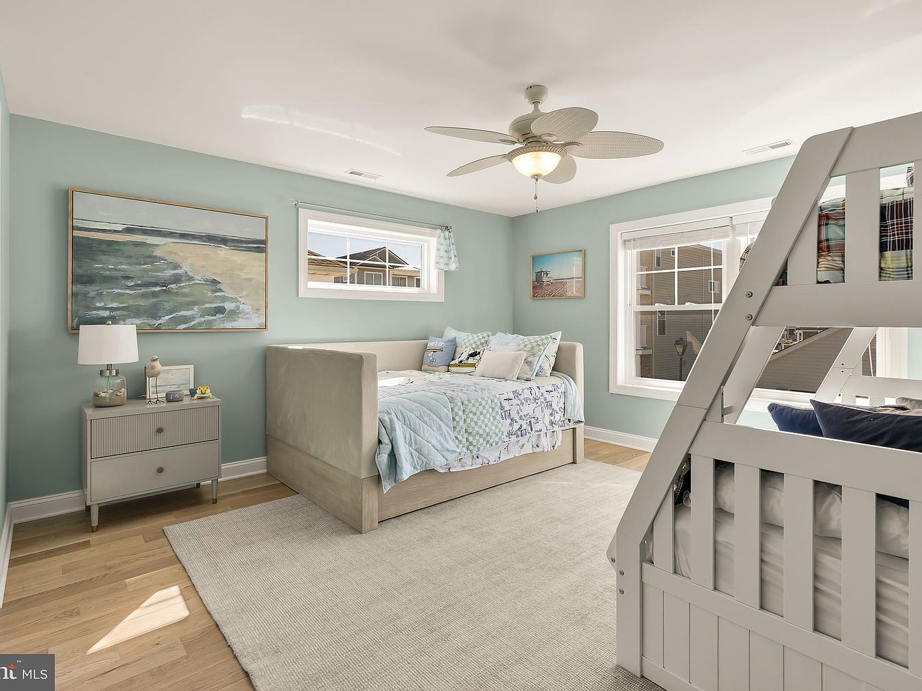 Featuring a light seafoam green wall color, this cozy bedroom accommodates a bunk bed with vibrant plaid-patterned bedding in red, yellow, and blue tones. The arrangement includes plush pillows with nautical-inspired designs, harmonizing with the coastal theme. A ceiling fan with oversized, leaf-like blades provides ventilation, while natural light floods the space, highlighting the warm wooden flooring. On the wall hang two serene artworks depicting sea turtles, enhancing the oceanic feel. The room’s layout is open and inviting, with ample space for additional furniture, creating a welcoming environment ideal for relaxation or play.