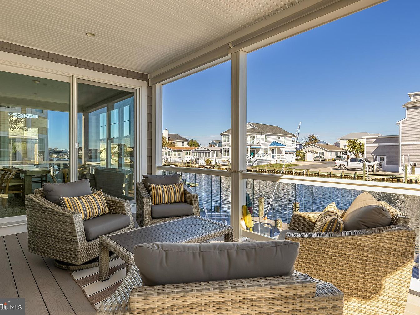 A serene waterfront patio features modern wicker seating with plush cushions, arranged in a relaxed circular configuration. Soft gray tones of the furniture contrast with vibrant striped accent cushions, enhancing the inviting atmosphere. The space is framed by large screened openings, allowing unobstructed views of a tranquil waterway and neighboring homes. The light beige decking complements the home’s exterior, adding warmth to the setting. Architectural details include wooden beams on the ceiling, enhancing the airy feel. Natural light floods the area, highlighting the peaceful ambiance and creating a perfect spot for leisure and social gatherings.