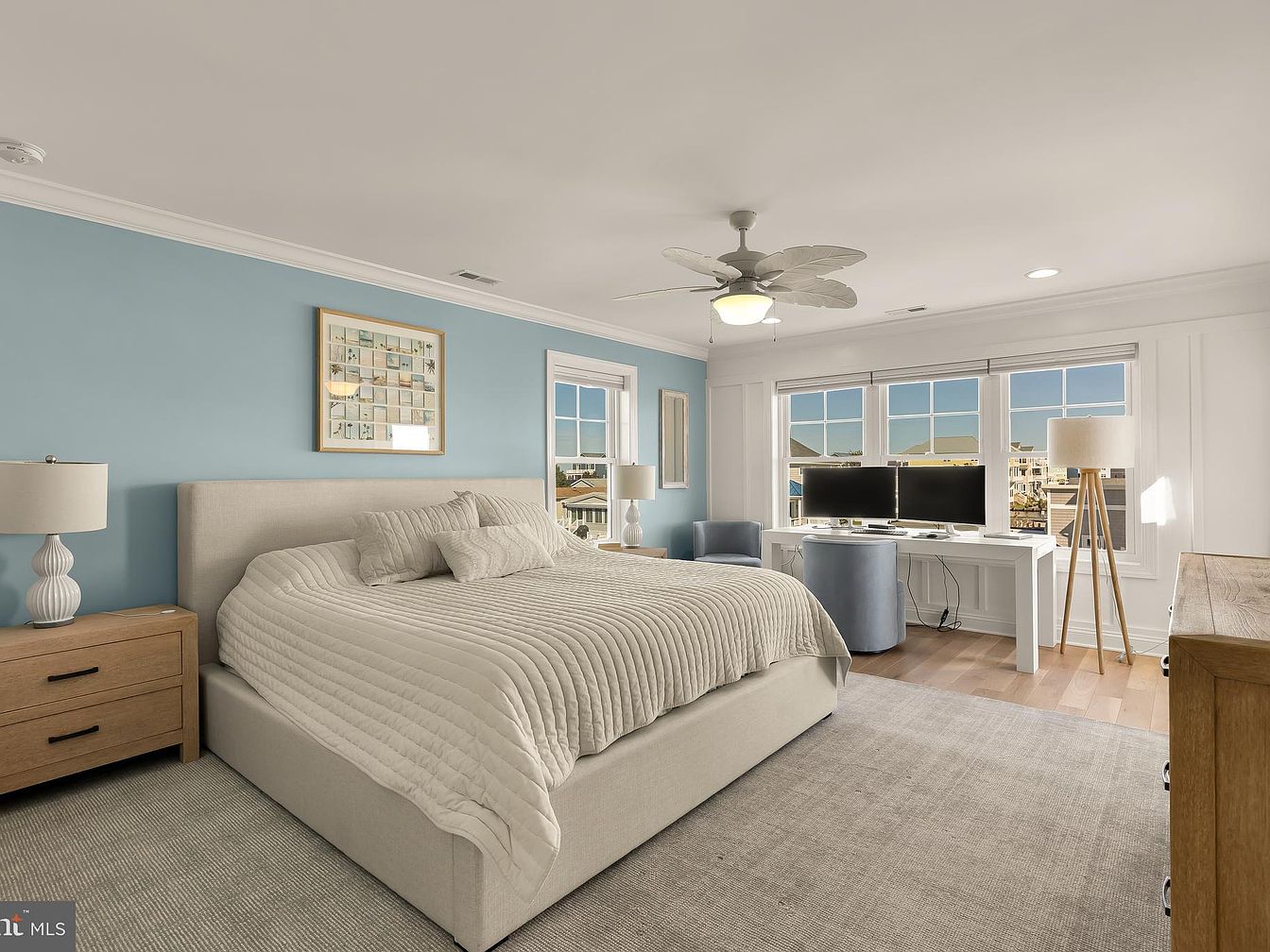 A spacious bedroom with a soothing palette of soft blue walls complements the light wood flooring. The bed, upholstered in a neutral beige fabric, features a textured quilt that adds warmth. Flanking the bed are two modern nightstands with clean lines, topped with decorative lamps. A cozy area rug anchors the space, while large windows invite plenty of natural light, enhancing the inviting atmosphere. Opposite the bed, a stylish desk with dual monitors and rounded blue chairs offers a functional workspace, seamlessly blending modern design with comfort. Architectural details like crown molding accentuate the room’s sophistication.