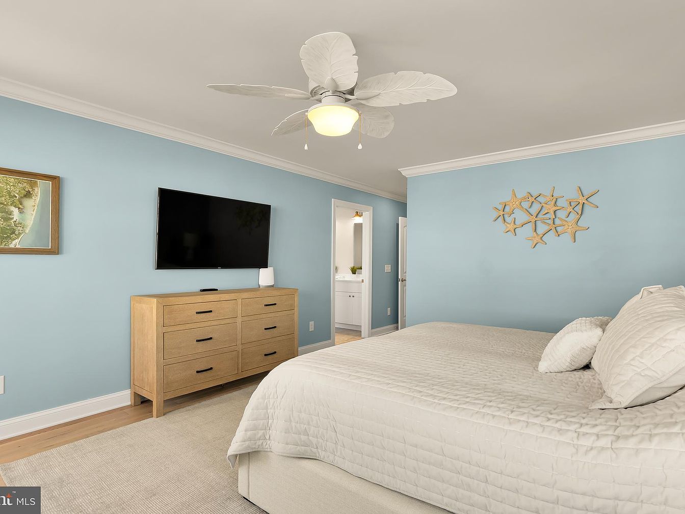 A tranquil bedroom featuring soft blue walls that evoke a serene coastal vibe. The room is anchored by a plush white bed with a quilted coverlet, matched by decorative pillows. A light-colored dresser with six spacious drawers complements the calming aesthetic. A wall-mounted flat-screen TV provides modern convenience against the backdrop of the soothing decor. Coastal-themed artwork hangs above the dresser, adding a touch of personality. Starfish motifs in natural tones are scattered on another wall, enhancing the thematic design. Natural light filters in, illuminating the space and highlighting the clean lines of the furniture.