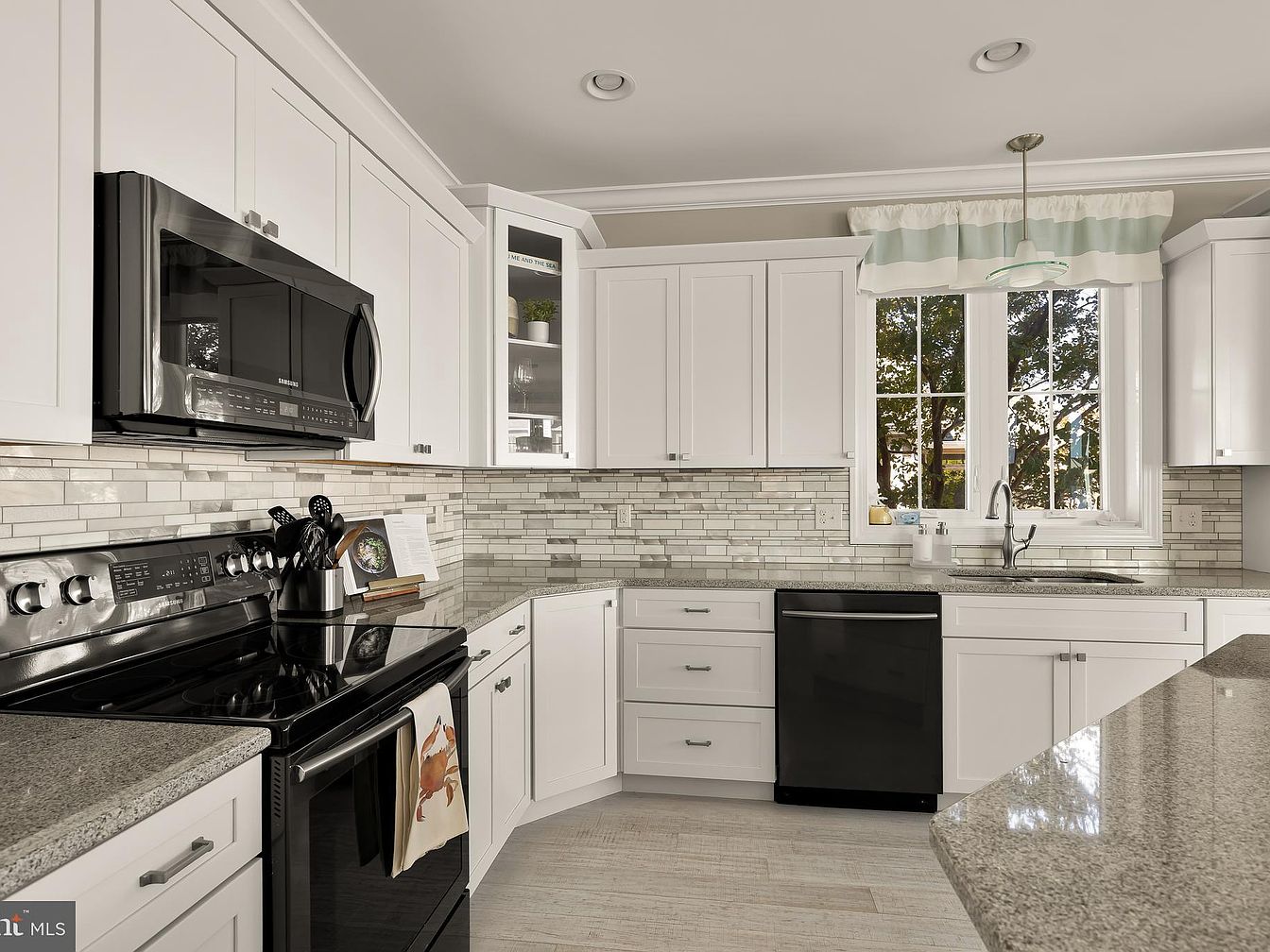 The kitchen features a spacious, open layout with sleek white cabinetry and a modern black kitchen appliance ensemble. A granite countertop stretches across the cabinets, providing a smooth, light gray surface. Backsplash tiles in a soft mosaic pattern add visual interest behind the stove and sink area. Natural light pours in through a large window adorned with a light, striped valance, offering views of greenery outside. Subtle recessed lighting enhances the bright, airy feel of the space. An elegant black dishwasher blends seamlessly with cabinetry, while the thoughtful arrangement promotes both functionality and style.