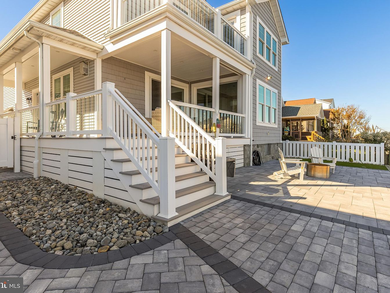 This outdoor space features a spacious patio with a modern design. The gray paver stones create an inviting surface, while a border of darker stones adds contrast. White railings guide the stairs leading to the house, enhancing its crisp architectural lines. A few Adirondack chairs are positioned for relaxation, accompanied by a small round table. The low-maintenance landscape includes river stones, providing a natural texture against the hardscape. Ample natural light streams from large windows on the house, emphasizing its open feel. Nearby greenery and a picket fence further enhance the inviting atmosphere of this outdoor retreat.
