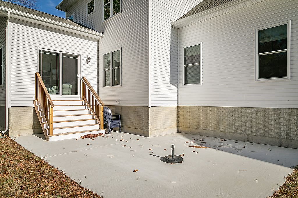 The image showcases a exterior patio area of a house, featuring a set of wooden stairs leading to a door that offers access to the interior. The steps are framed by simple railings, enhancing the welcoming design. The walls are clad in white siding, creating a clean and modern look, while the lower section is composed of a textured concrete base that contrasts subtly with the upper section. A single chair is positioned to the side, suggesting a casual spot to relax. The concrete floor is bare, with a few scattered leaves, indicating the seasonal transition.