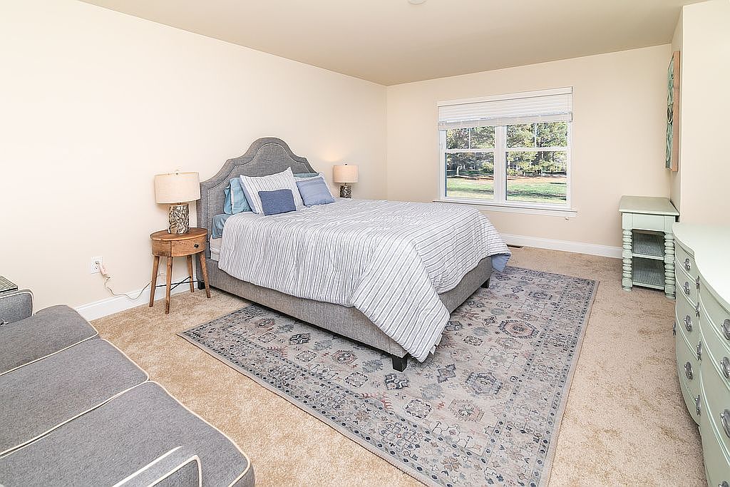 This cozy bedroom features a large, elegantly made bed with a gray striped comforter and an upholstered headboard. Soft blue and white throw pillows add a touch of color, harmonizing with the light beige walls. A patterned area rug lies underfoot, complementing the plush carpet. Adjacent, a vintage-style bedside table holds a warm bedside lamp. Across the room, a minimalist dresser in a soft green contrasts with the muted palette, while large windows flood the space with natural light, offering a tranquil view of the outdoors. A gray upholstered loveseat invites relaxation, enhancing the serene atmosphere.