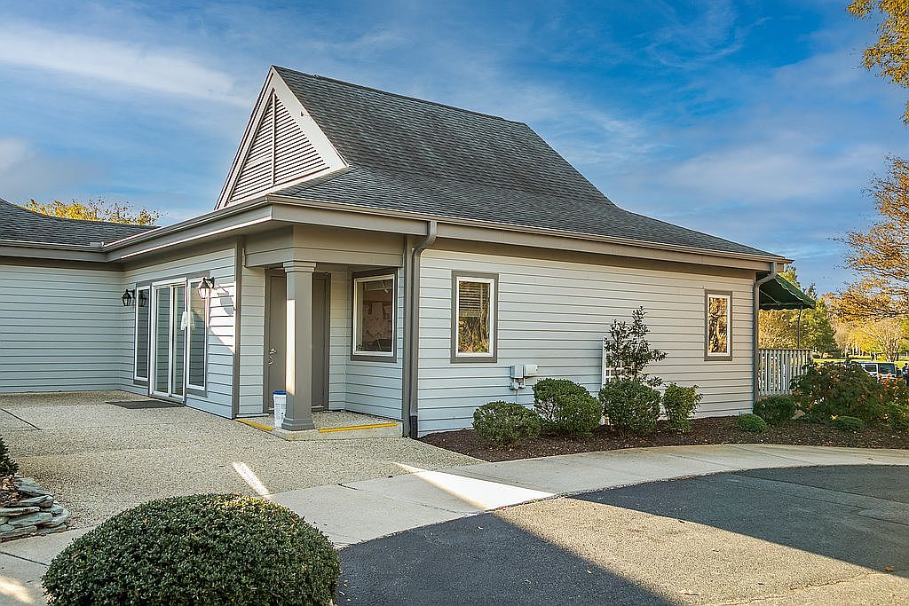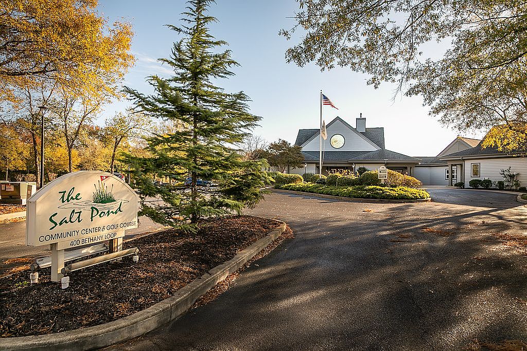 A welcoming entrance to the Salt Pond Community Center and Golf Course, featuring a landscaped area with neatly trimmed shrubs and a large tree. The sign is prominently displayed, hinting at the community’s identity with green lettering against a white background. The building is of a light-colored siding, paired with a peaked roof and a large round window, suggesting a blend of modern and traditional design elements. The pathway is paved, inviting visitors in, while colorful autumn foliage adds a vibrant seasonal touch, enhancing the natural beauty of the setting.