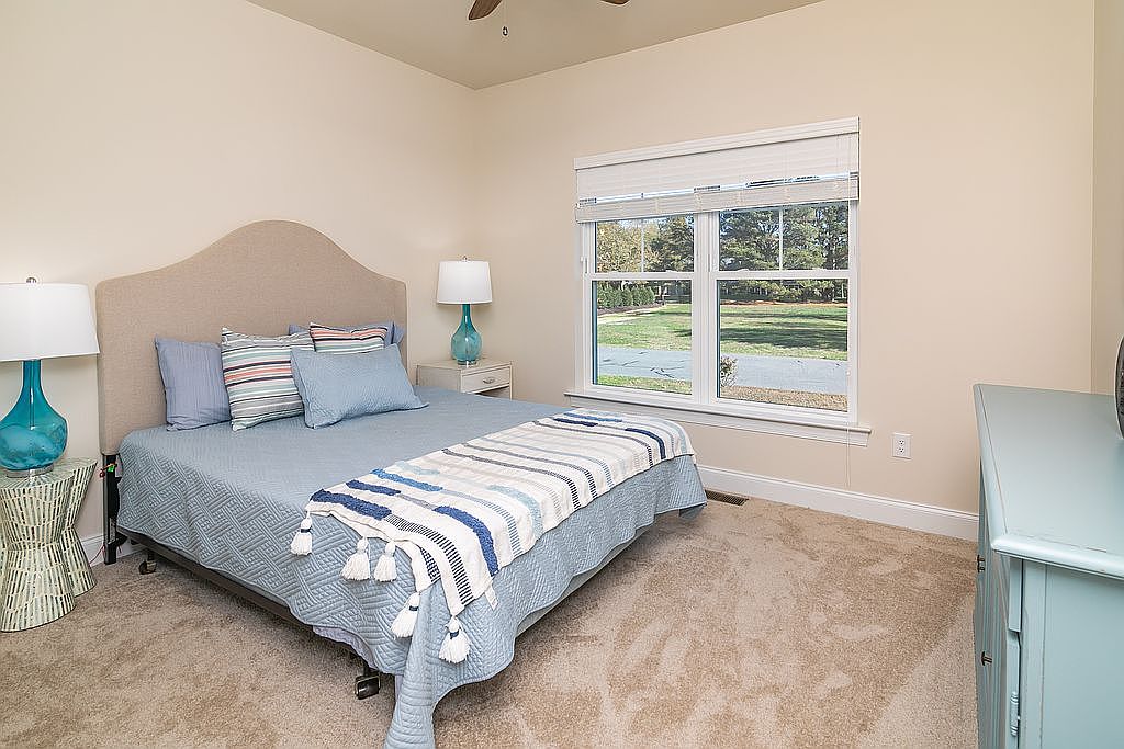 A serene bedroom featuring a central bed adorned with a light blue quilt and coordinating pillows in various shades of blue, creating a cohesive color scheme. Flanking the bed are stylish bedside lamps with teal bases, contributing a touch of modern flair. A textured woven throw adds depth at the foot of the bed. The room’s walls painted in a soft beige complement the warm, plush carpet, enhancing comfort. A large window with white trim allows natural light to fill the space, offering a view of the outside greenery. An aqua-colored dresser adds a pop of color, harmonizing with the overall aesthetic.