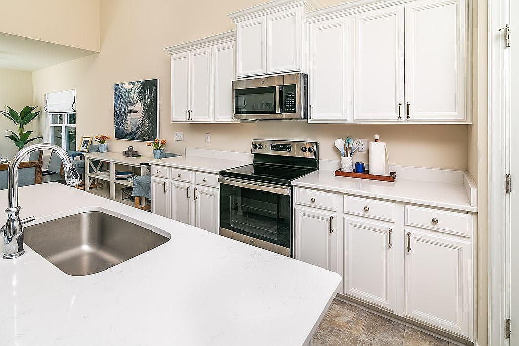This kitchen features a spacious layout, highlighted by clean white cabinetry and a large island with a quartz countertop. Stainless steel appliances offer a modern touch, contrasting against the bright cabinetry. A smooth cooktop is adjacent to the sleek microwave, enhancing functionality. The flooring is a neutral, durable tile that complements the light color scheme. Natural light floods in from several windows, brightening the area. Open shelving displays kitchenware, while decorative elements like potted plants add a vibrant touch. The adjacent dining area is slightly visible, showcasing a cozy, inviting atmosphere perfect for gatherings.
