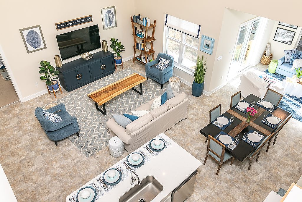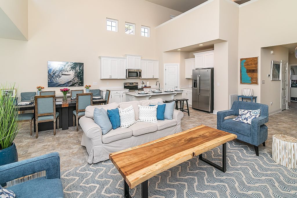 This spacious living room features an open layout that blends seamlessly with the kitchen and dining area. Light neutral walls enhance the airy feel, while large windows invite ample natural light. A cozy, beige sofa adorned with blue and white pillows anchors the space, accompanied by two blue accent chairs. A striking wooden coffee table contrasts with a patterned rug beneath it. A sizable dining table set for six sits beside the kitchen, showcasing blue and tan chairs. Decorative elements like potted plants and artwork on the walls add personality, highlighting a modern yet inviting aesthetic.