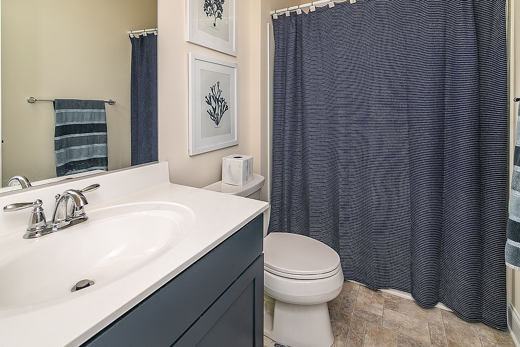 This bathroom features a modern design with a clean and functional layout. A white vanity with a deep sink provides ample space for daily routines. The cabinetry is painted in a deep blue, adding a touch of color against the soft beige walls. A large mirror reflects light, enhancing the room’s brightness. The blue and white striped shower curtain complements the color scheme, creating a cohesive aesthetic. A striped towel hangs nearby, matching the curtain. The floor is tiled with light-colored, textured porcelain tiles, adding warmth and style. Framed botanical prints adorn the walls, contributing to a tranquil, nature-inspired ambiance.