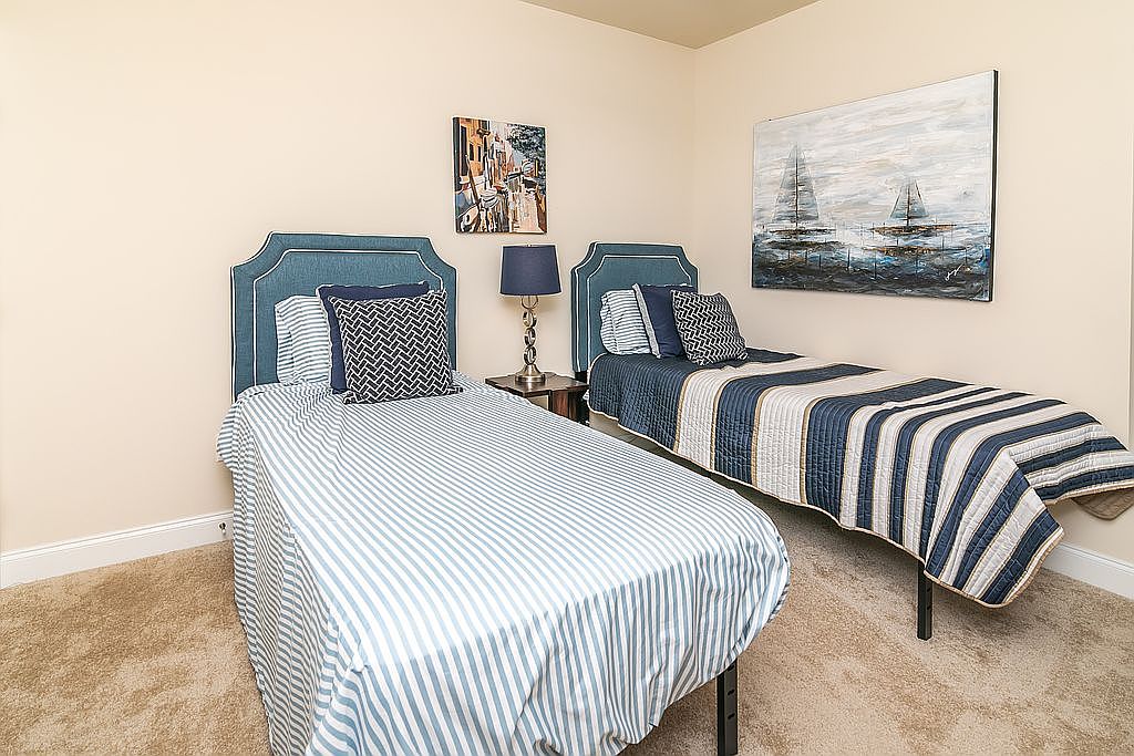 This bedroom features two twin beds with stylish blue and white striped bedding, creating a cohesive nautical theme. The walls are painted a soft beige, enhancing the light and airy feel of the space. A plush carpet adds warmth underfoot, while a blue headboard accentuates each bed’s design. Decorative pillows in varying patterns and textures provide visual interest. Beside one bed, a sleek nightstand supports a modern lamp with a navy shade. The room’s architectural details include double doors leading to an adjoining space, adding functionality while maintaining an open layout.