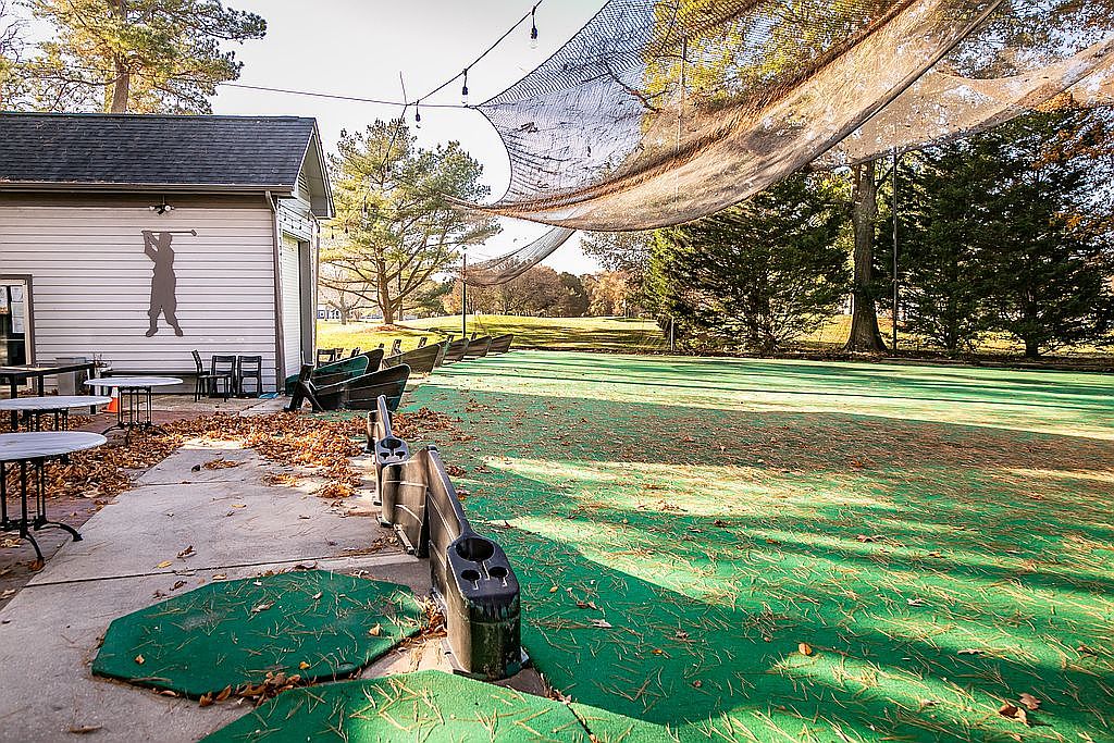 This image showcases an outdoor golf practice area with a vibrant green turf surface, surrounded by a natural setting of trees. A small building, possibly a clubhouse, has a stylish golf silhouette on its exterior. Various tables and chairs are arranged nearby, inviting social gatherings. Overhead, a protective netting stretches across the space, providing a barrier while allowing an open view of the sky. The layout is designed for both practice and leisure, with leaves scattered on the ground indicating a fall season. This area blends functionality and relaxation, catering to golf enthusiasts.
