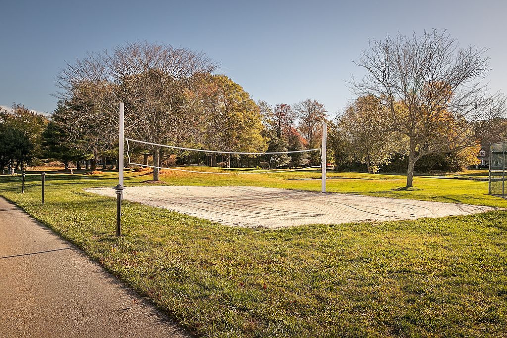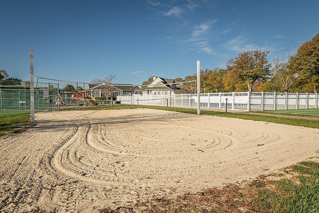 A sandy volleyball court occupies the foreground, featuring two white posts marking the net’s location. The surface is smooth, with tire tracks and footprints suggesting recent activity. Behind the court, a multi-purpose area is visible, including tennis courts fenced in green. A white picket fence surrounds the space, providing a neat border that adds a quaint, community feel. In the distance, a historic American home with a gabled roof and large windows can be seen, surrounded by trees donning fall colors. The bright blue sky and wispy clouds add to the inviting atmosphere of this recreational area.
