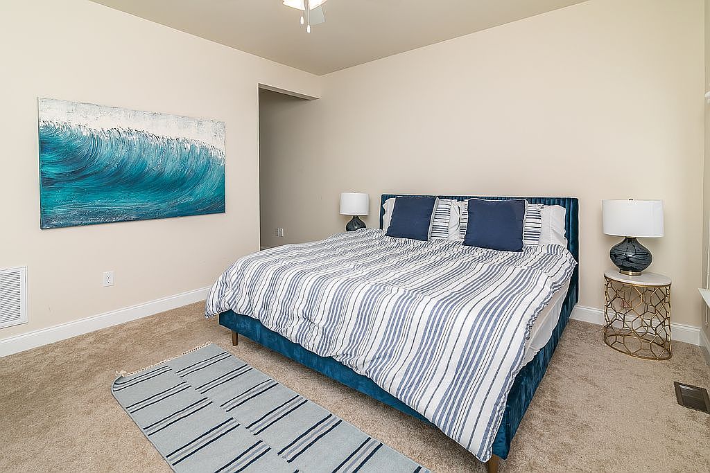 A serene bedroom exuding coastal charm. The wall features a striking abstract painting of a wave, rendered in vibrant teal and white, enhancing the room’s tranquil atmosphere. The bed, dressed in a cozy striped duvet of cool blues and soft whites, invites comfort, flanked by modern bedside tables with circular metallic bases supporting stylish lamps. A plush area rug with horizontal stripes adds warmth underfoot, while neutral beige walls and carpeting create a soft backdrop. Natural light pours in, creating an airy feel, and the simplicity of the design elements fosters a peaceful retreat.