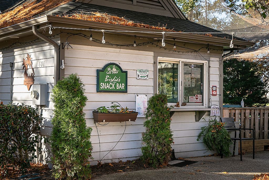 A charming snack bar with a rustic flair features a light-colored wooden exterior and a sloped roof adorned with autumn leaves. The green sign reads ‘Birdie’s Snack Bar,’ complemented by inviting potted plants on a ledge beneath the window. A small service window allows customers to order food, framed by casual decorative lights adding warmth. To the left, an emblem of a palm tree enhances the tropical vibe, while lush green hedges create a natural border around the space. The overall aesthetic combines a laid-back atmosphere with functional design, perfect for casual dining.