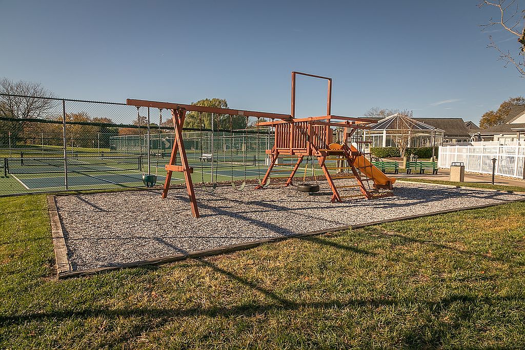 A vibrant playground set is situated on a gravel bed, framed by green grass. The structure features a wooden frame with a slide and swings, painted in warm orange. Surrounding the playground are tennis courts, visible in the background, enclosed by fences that add a sense of structure to the space. A clear blue sky overhead enhances the cheerful ambience, while the well-maintained grass borders the playground, inviting play. Nearby benches are positioned for relaxation and supervision, emphasizing the space’s family-friendly design. This recreational area combines fun and functionality in a serene outdoor setting.
