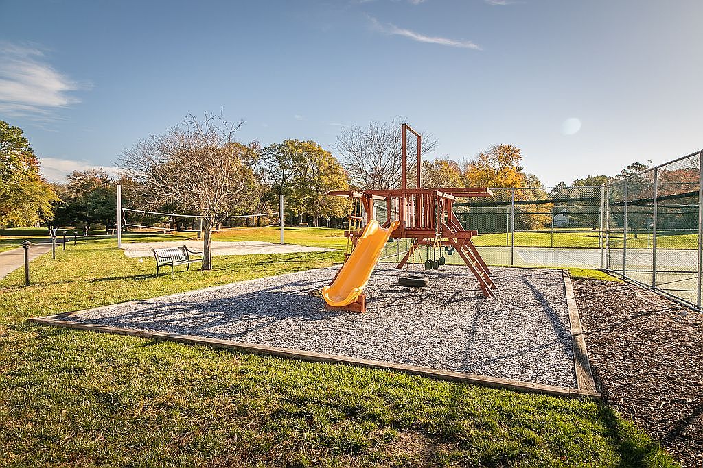 A vibrant playground featuring a wooden playset with a bright yellow slide and swings, surrounded by pebble ground cover. The playset is framed by tall trees, their leaves showing autumn colors, creating a warm and inviting setting. A bench is positioned nearby, offering a place for caregivers to relax while watching children play. The layout includes a grassy area that transitions smoothly to a gravel surface, enhancing safety for kids. In the background, a volleyball court and a tennis court are visible, indicating a multifunctional recreational space. The scene is illuminated by gentle sunlight, adding to its cheerful ambiance.